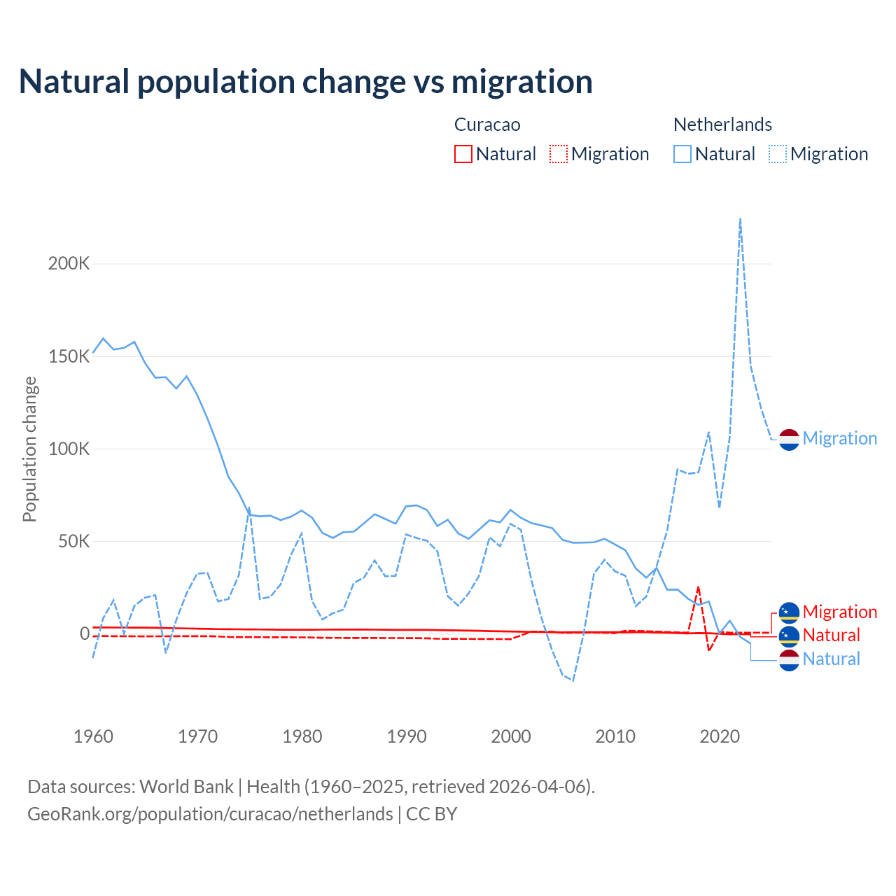 Over the last 10 years, 3.72% of the population change in Curacao is from natural causes (a gain of 834 people) and 96.3% is from migration (a gain of 21,615 people). In the Netherlands 11.8% is from natural causes (a gain of 134,554 people) and 88.2% is from migration (a gain of 1,006,495 people).