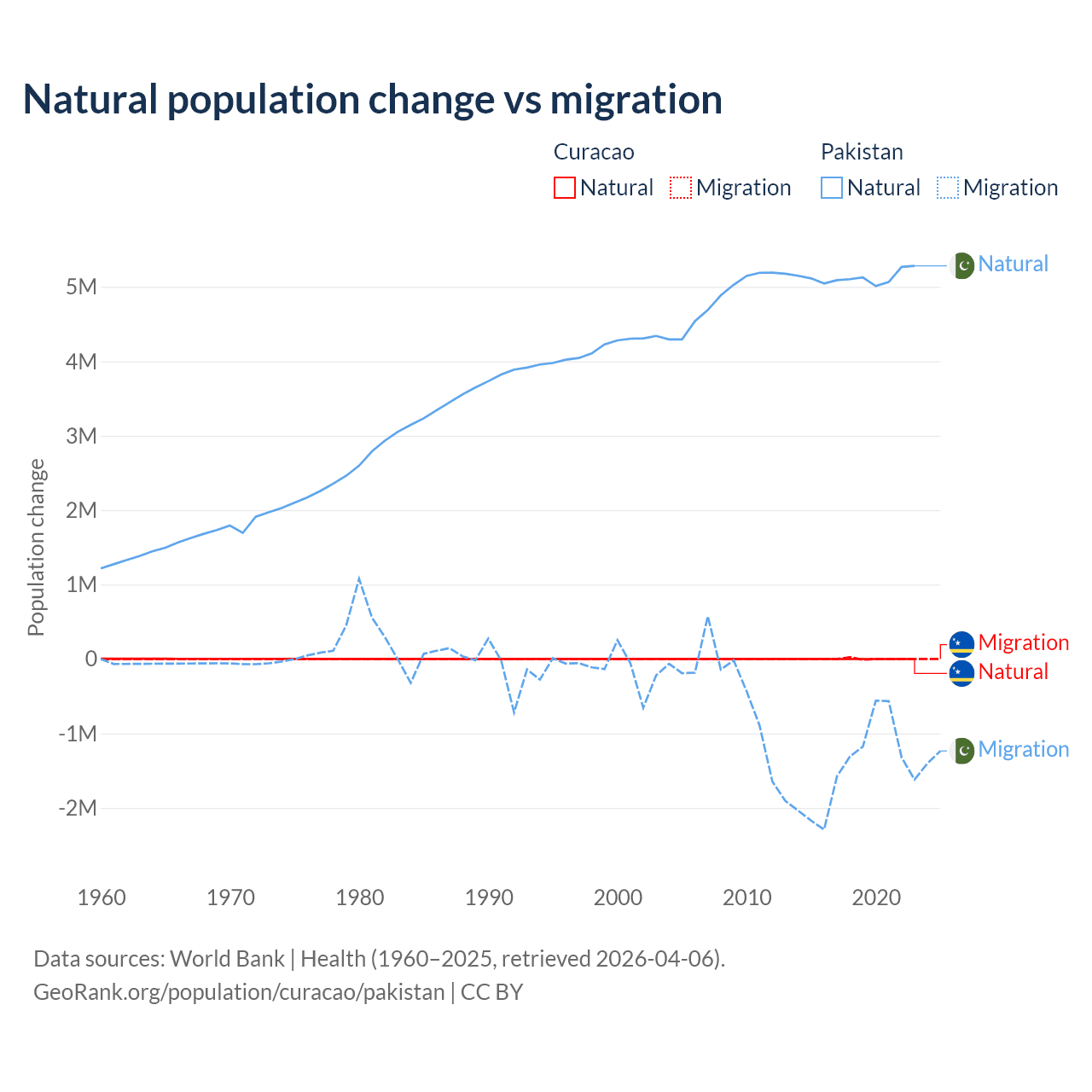 Over the last 10 years, 3.72% of the population change in Curacao is from natural causes (a gain of 834 people) and 96.3% is from migration (a gain of 21,615 people). In Pakistan 77.8% is from natural causes (a gain of 51,255,404 people) and 22.2% is from migration (a loss of 14,629,055 people).