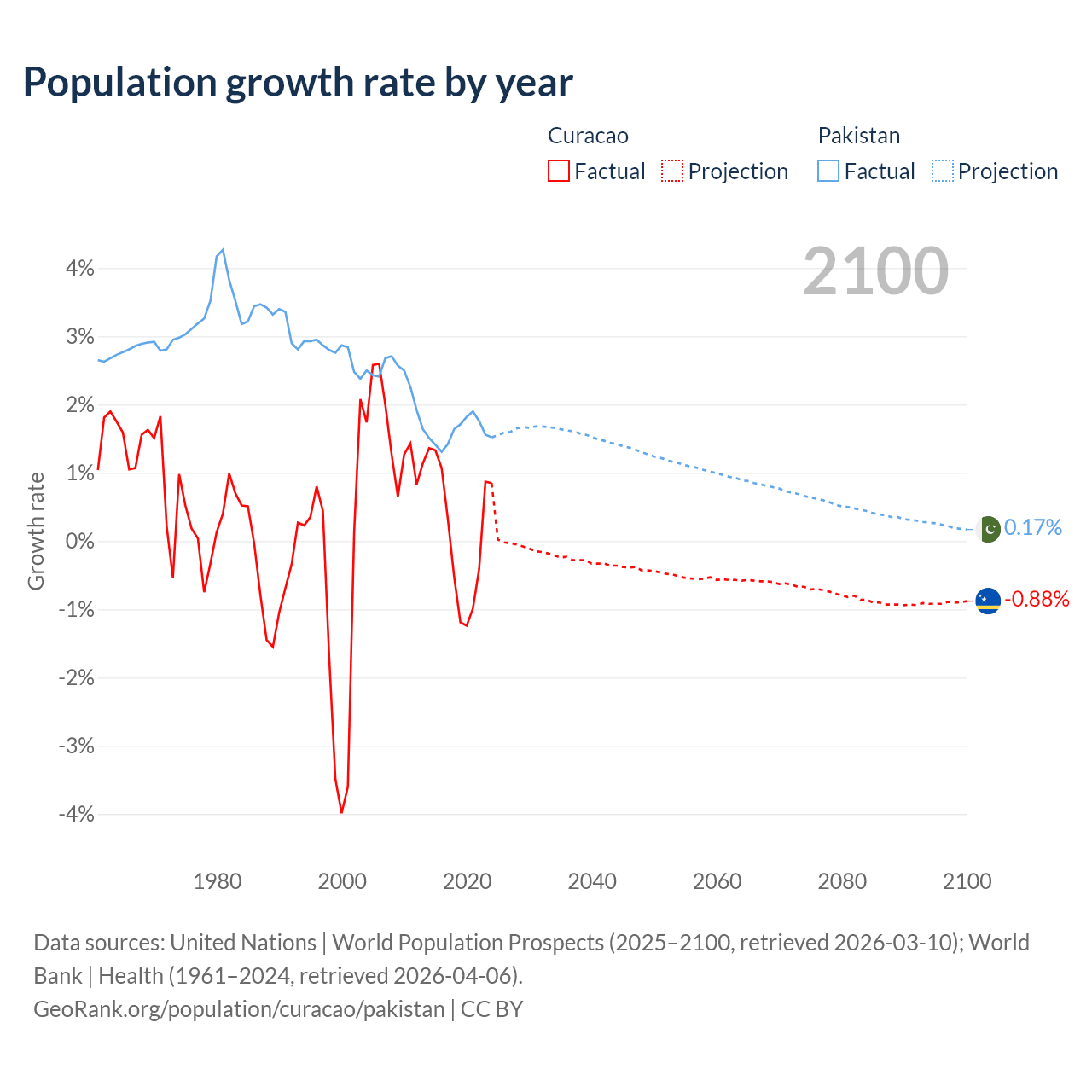 - For the last 10 years, Curacao has had an average growth rate of +0.13% per year vs +1.6% in Pakistan.