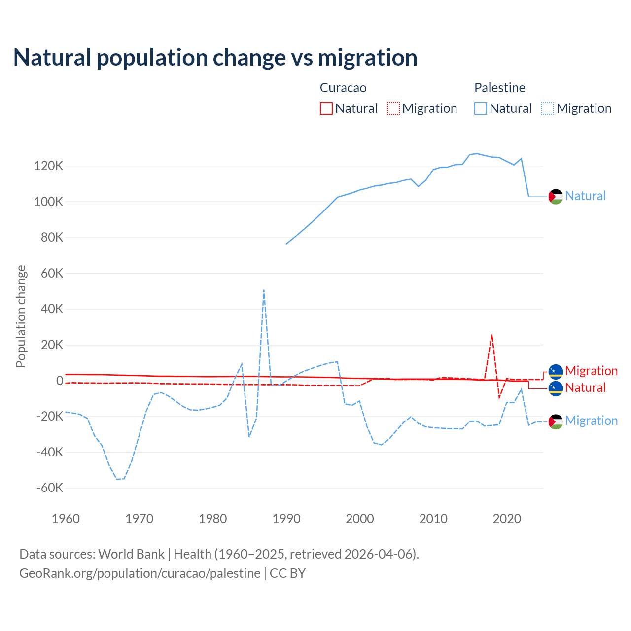 Over the last 10 years, 3.72% of the population change in Curacao is from natural causes (a gain of 834 people) and 96.3% is from migration (a gain of 21,615 people). In Palestine 85.7% is from natural causes (a gain of 1,218,010 people) and 14.3% is from migration (a loss of 202,820 people).