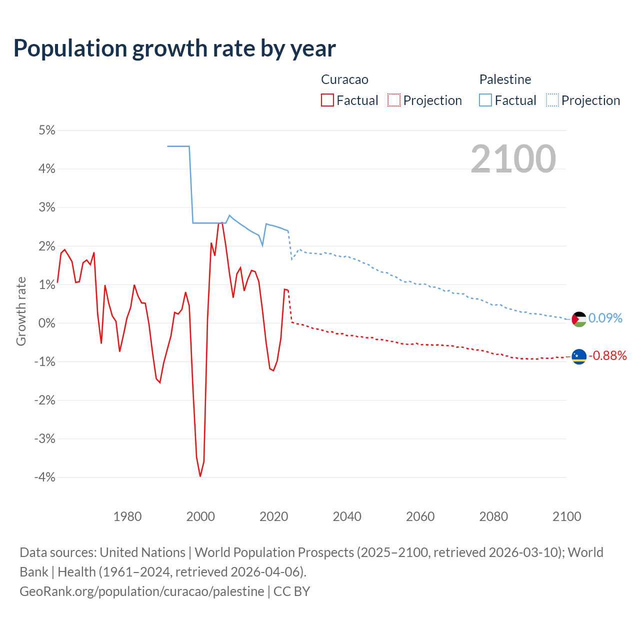 - For the last 10 years, Curacao has had an average growth rate of +0.13% per year vs +2.4% in Palestine.