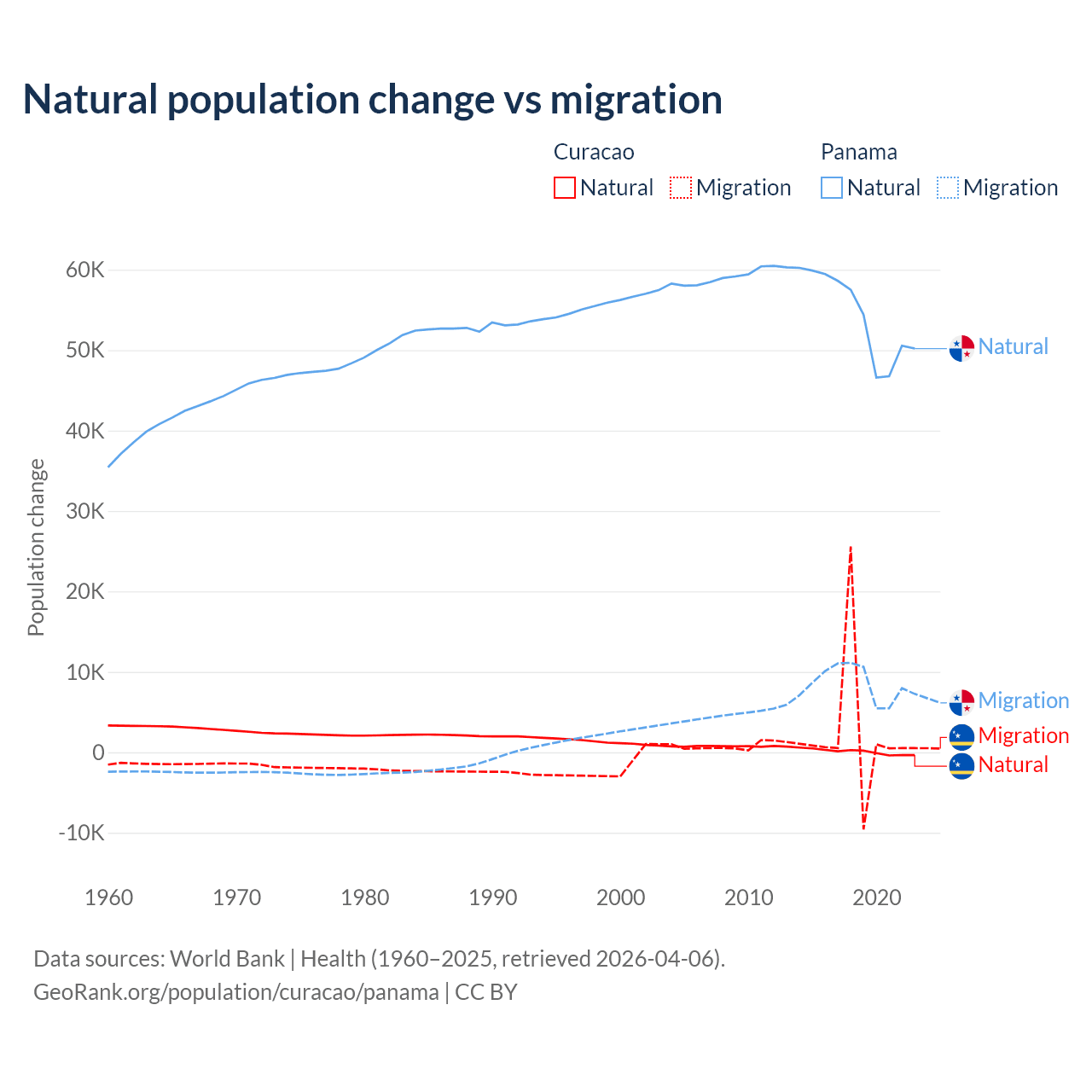 Over the last 10 years, 3.72% of the population change in Curacao is from natural causes (a gain of 834 people) and 96.3% is from migration (a gain of 21,615 people). In Panama 86.5% is from natural causes (a gain of 544,211 people) and 13.5% is from migration (a gain of 84,849 people).