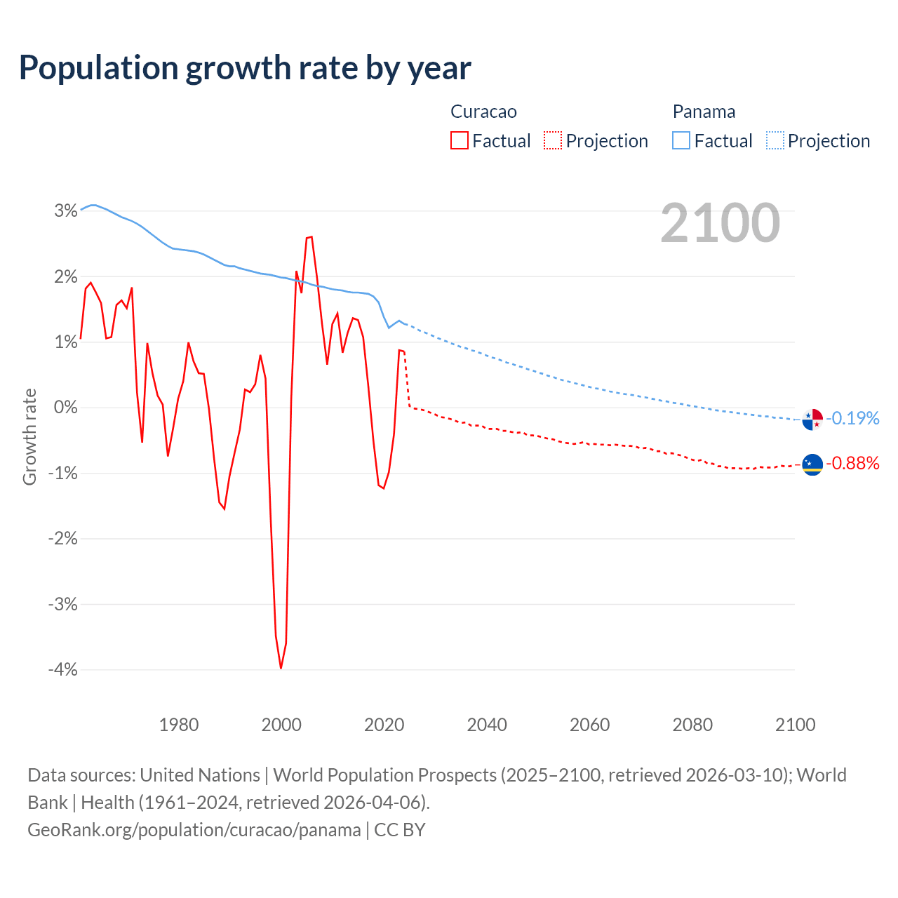 - For the last 10 years, Curacao has had an average growth rate of +0.13% per year vs +1.52% in Panama.
