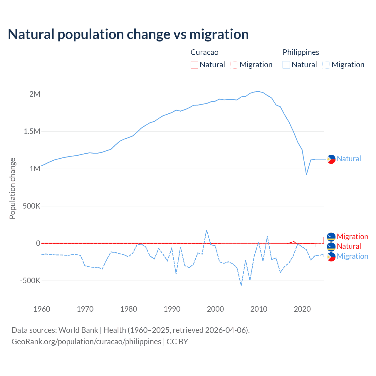 Over the last 10 years, 3.72% of the population change in Curacao is from natural causes (a gain of 834 people) and 96.3% is from migration (a gain of 21,615 people). In the Philippines 88.5% is from natural causes (a gain of 14,279,705 people) and 11.5% is from migration (a loss of 1,848,117 people).