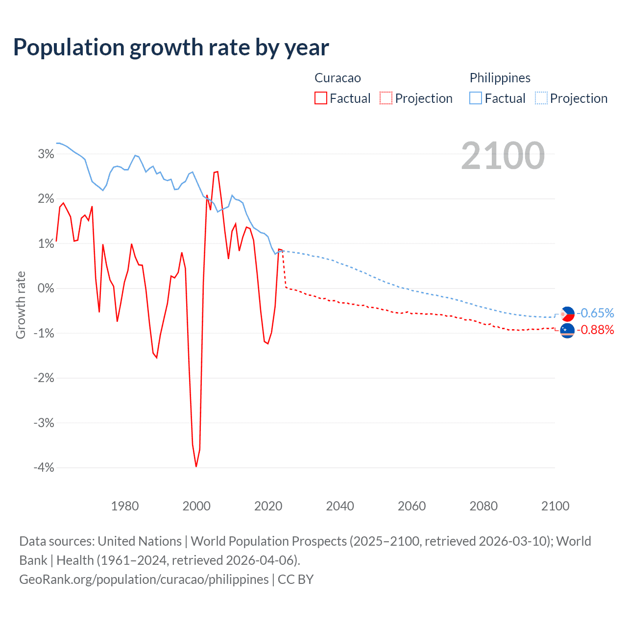 Data sources: World Bank | Health (1960–2024, retrieved 2026-04-06); United Nations | World Population Prospects (1960–2026, retrieved 2026-03-10); U.S. Census Bureau (1960–2025, retrieved 2026-02-08); Central Intelligence Agency (CIA) (2000–2019, retrieved 2026-02-20).
