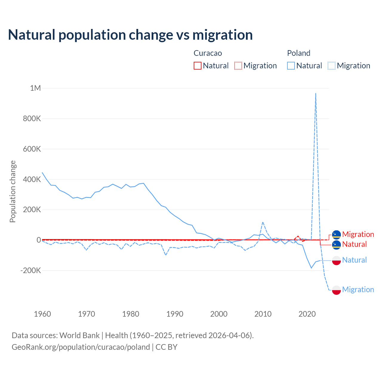 Over the last 10 years, 3.72% of the population change in Curacao is from natural causes (a gain of 834 people) and 96.3% is from migration (a gain of 21,615 people). In Poland 41.4% is from natural causes (a loss of 675,443 people) and 58.6% is from migration (a gain of 955,766 people).