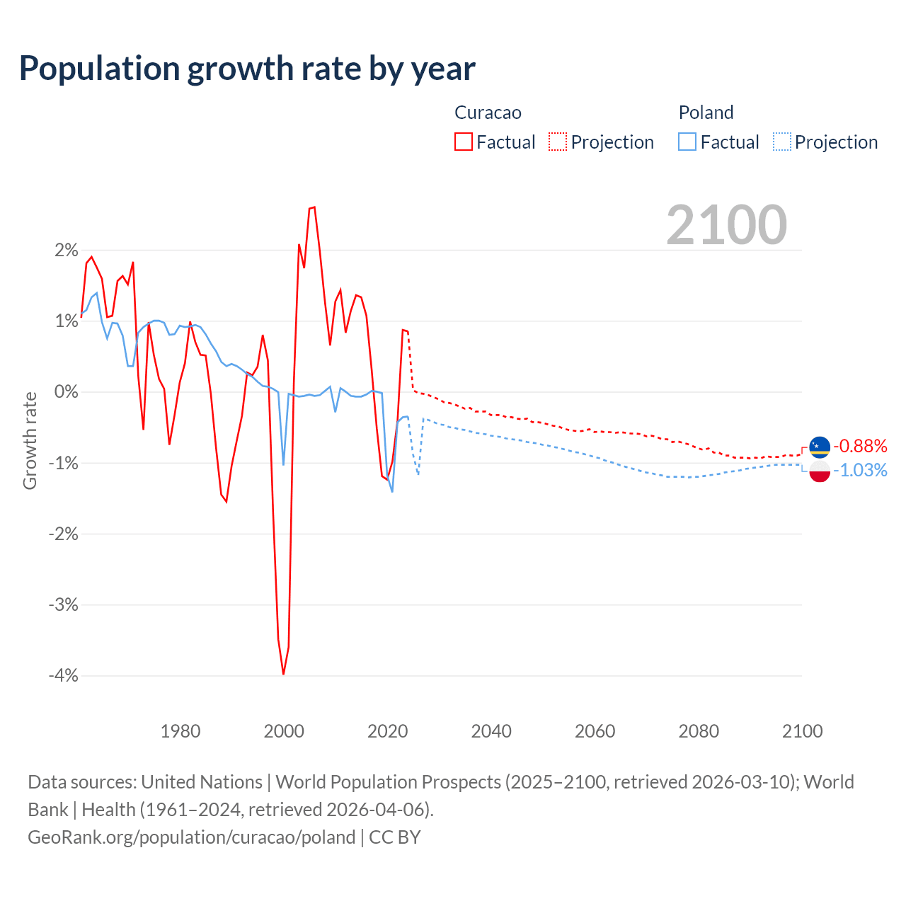 - For the last 10 years, Curacao has had an average growth rate of +0.13% per year vs -0.36% in Poland.
