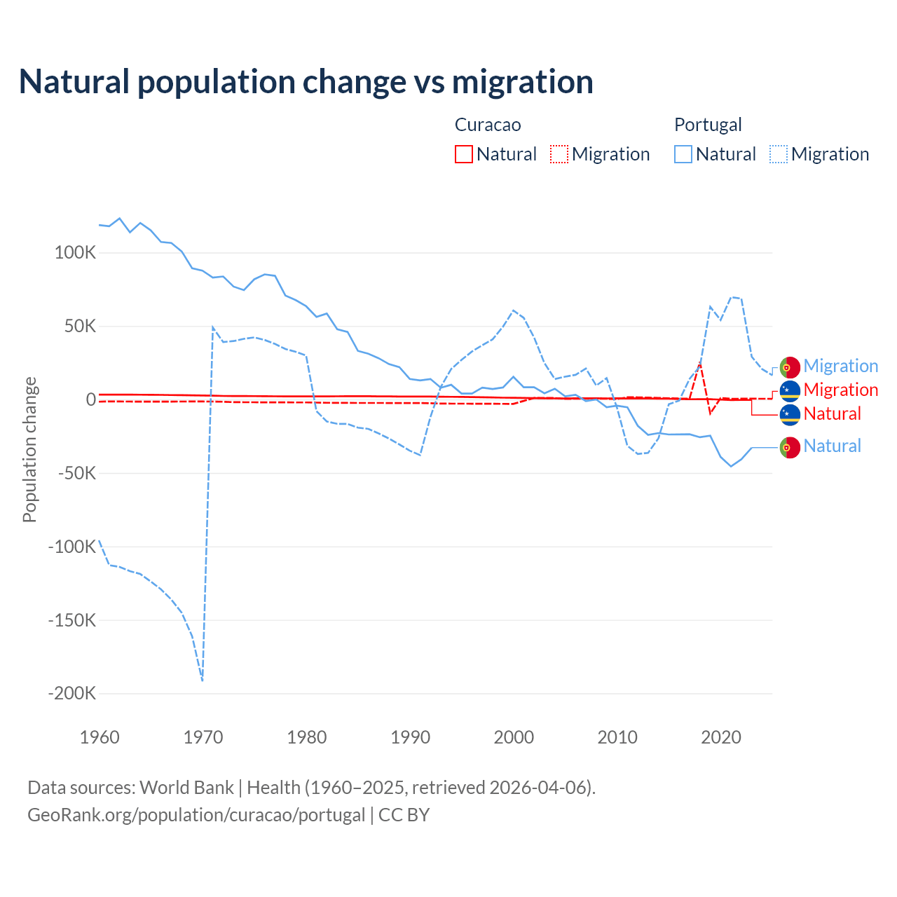 Over the last 10 years, 3.72% of the population change in Curacao is from natural causes (a gain of 834 people) and 96.3% is from migration (a gain of 21,615 people). In Portugal 51% is from natural causes (a loss of 302,748 people) and 49% is from migration (a gain of 290,554 people).