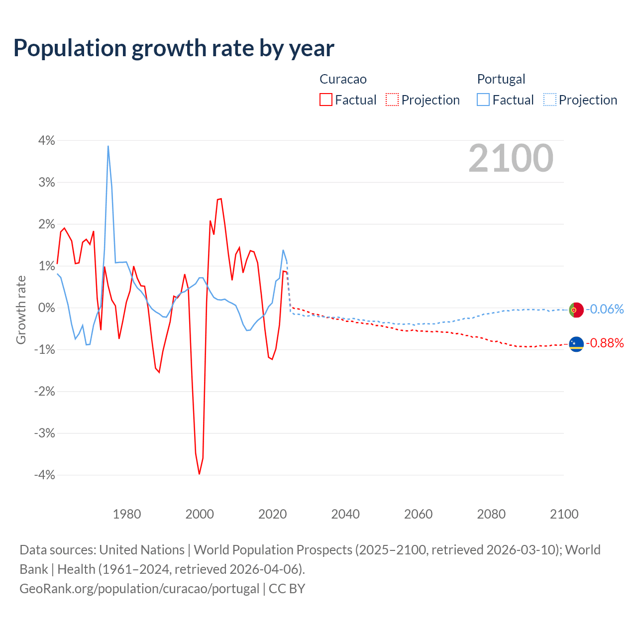 - For the last 10 years, Curacao has had an average growth rate of +0.13% per year vs +0.21% in Portugal.