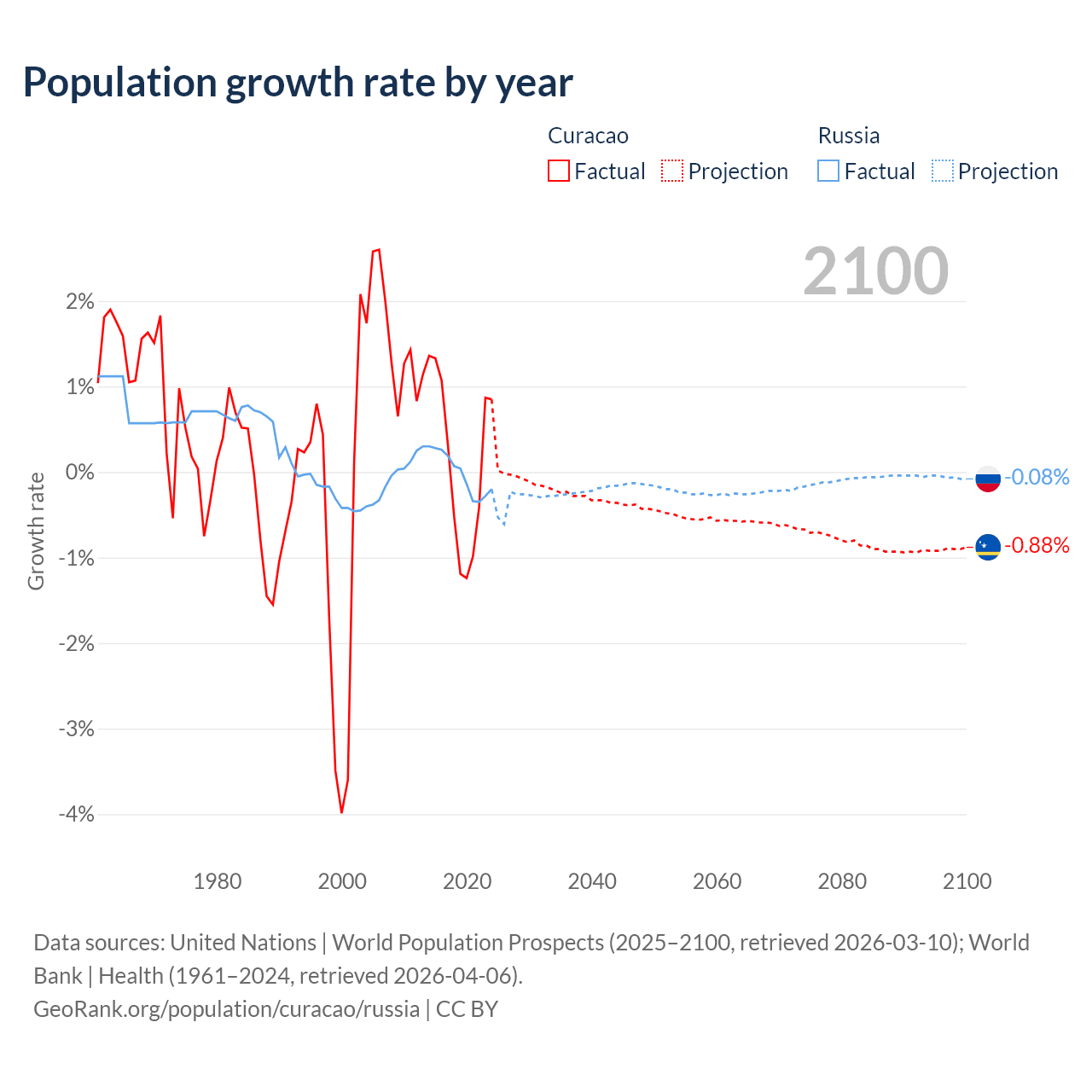- For the last 10 years, Curacao has had an average growth rate of +0.13% per year vs -0.02% in Russia.