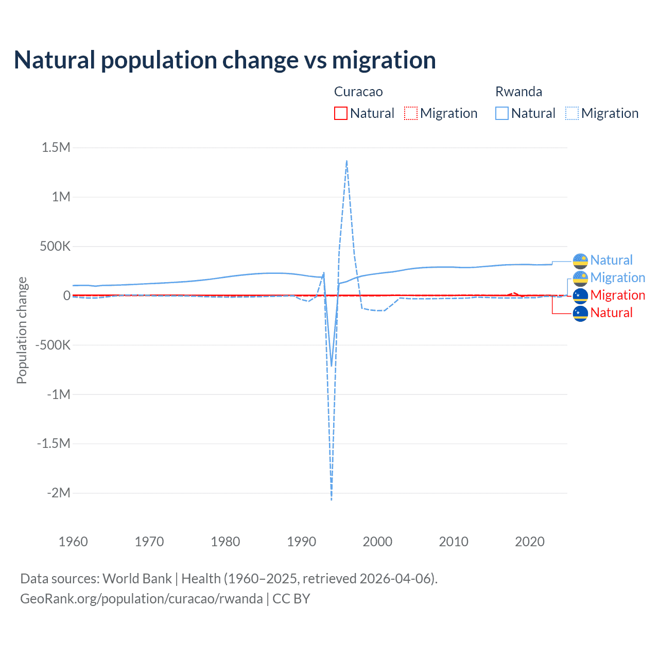 Over the last 10 years, 3.72% of the population change in Curacao is from natural causes (a gain of 834 people) and 96.3% is from migration (a gain of 21,615 people). In Rwanda 93.8% is from natural causes (a gain of 3,081,296 people) and 6.18% is from migration (a loss of 203,035 people).