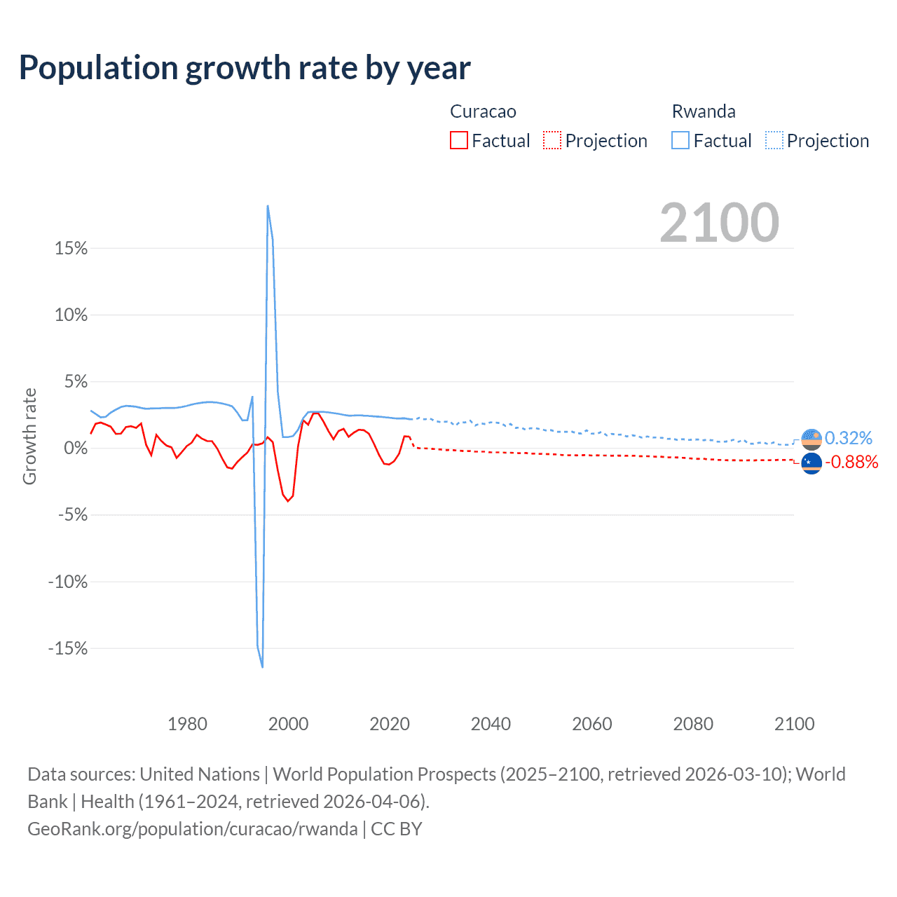 - For the last 10 years, Curacao has had an average growth rate of +0.13% per year vs +2.31% in Rwanda.