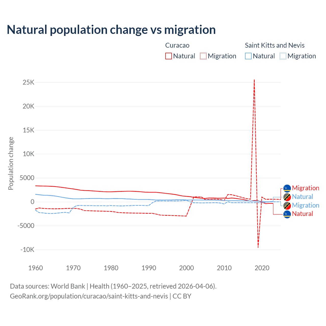Over the last 10 years, 3.72% of the population change in Curacao is from natural causes (a gain of 834 people) and 96.3% is from migration (a gain of 21,615 people). In Saint Kitts and Nevis 44.9% is from natural causes (a gain of 1,225 people) and 55.1% is from migration (a loss of 1,506 people).