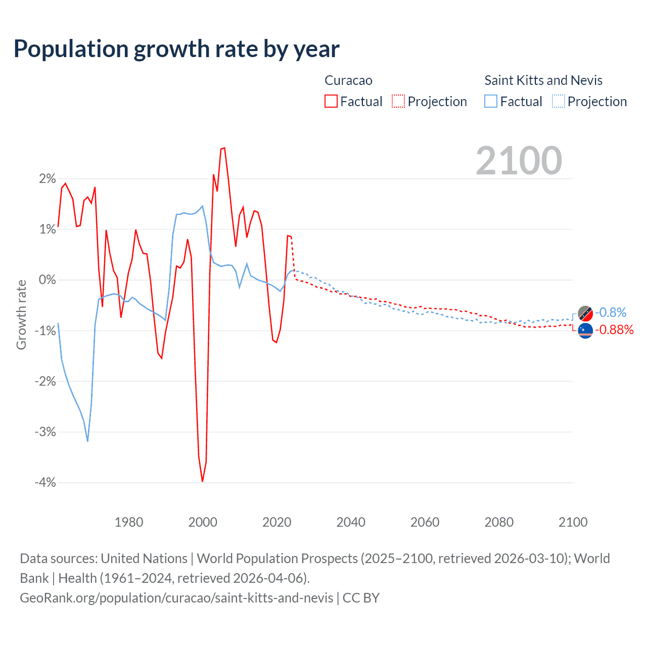 - For the last 10 years, Curacao has had an average growth rate of +0.13% per year vs -0.04% in Saint Kitts and Nevis.