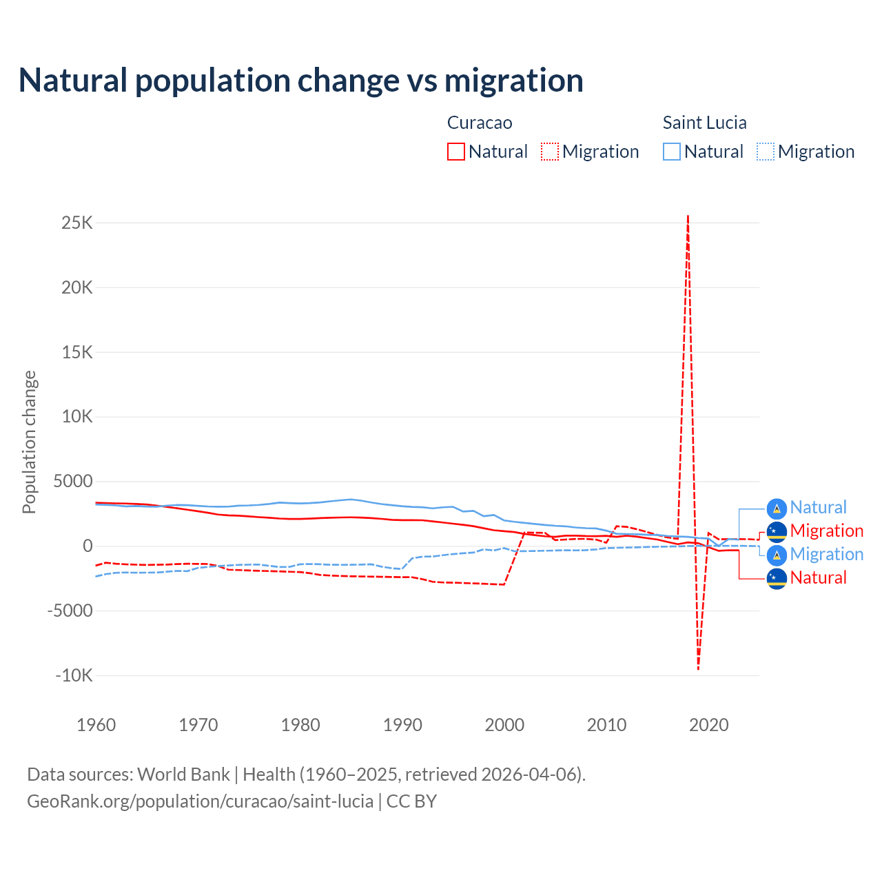 Over the last 10 years, 3.72% of the population change in Curacao is from natural causes (a gain of 834 people) and 96.3% is from migration (a gain of 21,615 people). In Saint Lucia 95.7% is from natural causes (a gain of 6,039 people) and 4.31% is from migration (a loss of 272 people).