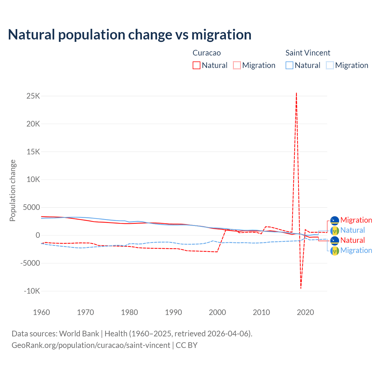 Over the last 10 years, 3.72% of the population change in Curacao is from natural causes (a gain of 834 people) and 96.3% is from migration (a gain of 21,615 people). In Saint Vincent 21.2% is from natural causes (a gain of 2,525 people) and 78.8% is from migration (a loss of 9,393 people).