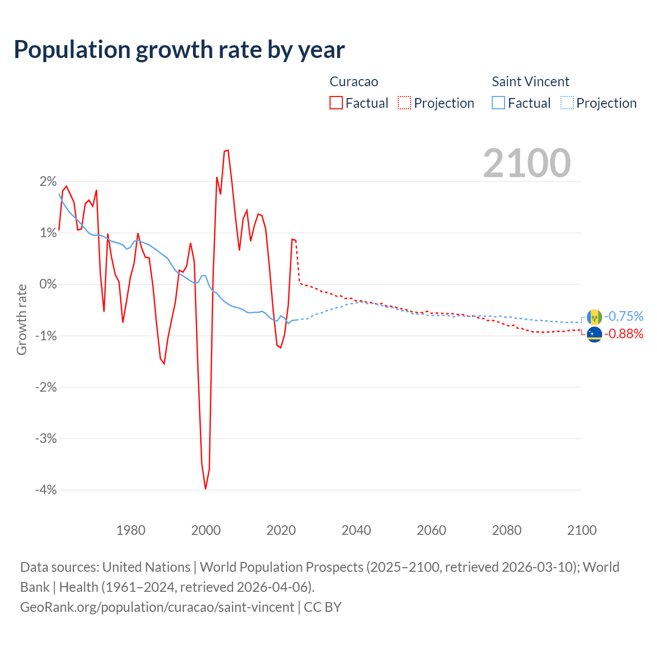 - For the last 10 years, Curacao has had an average growth rate of +0.13% per year vs -0.65% in Saint Vincent.