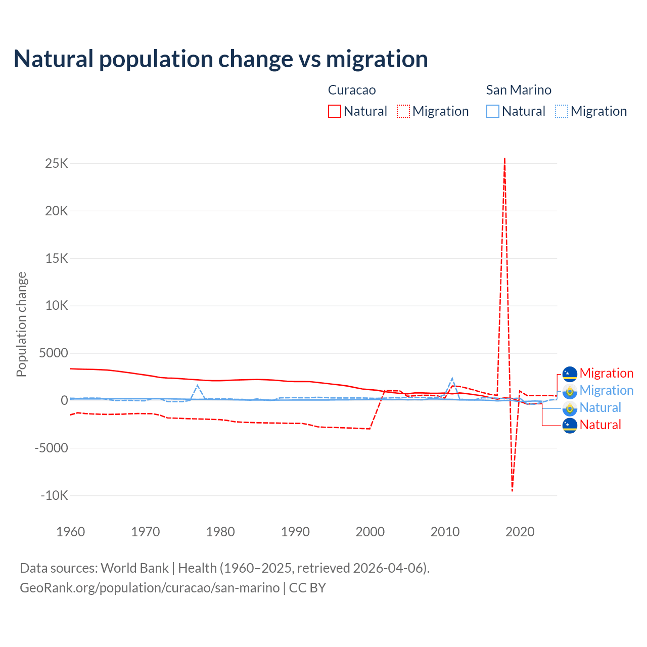 Over the last 10 years, 3.72% of the population change in Curacao is from natural causes (a gain of 834 people) and 96.3% is from migration (a gain of 21,615 people). In San Marino 40.9% is from natural causes (a loss of 358 people) and 59.1% is from migration (a gain of 517 people).