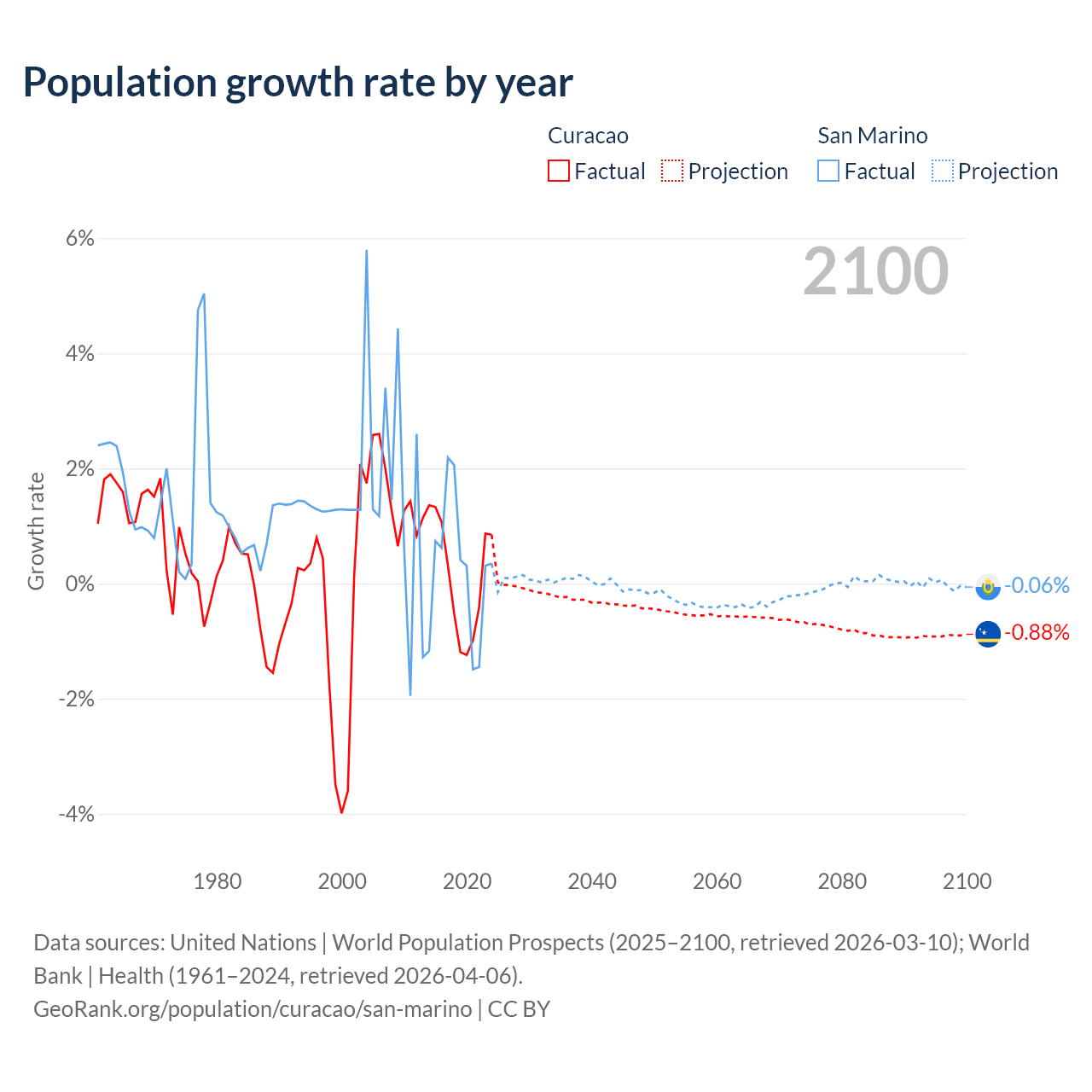 - For the last 10 years, Curacao has had an average growth rate of +0.13% per year vs +0.26% in San Marino.