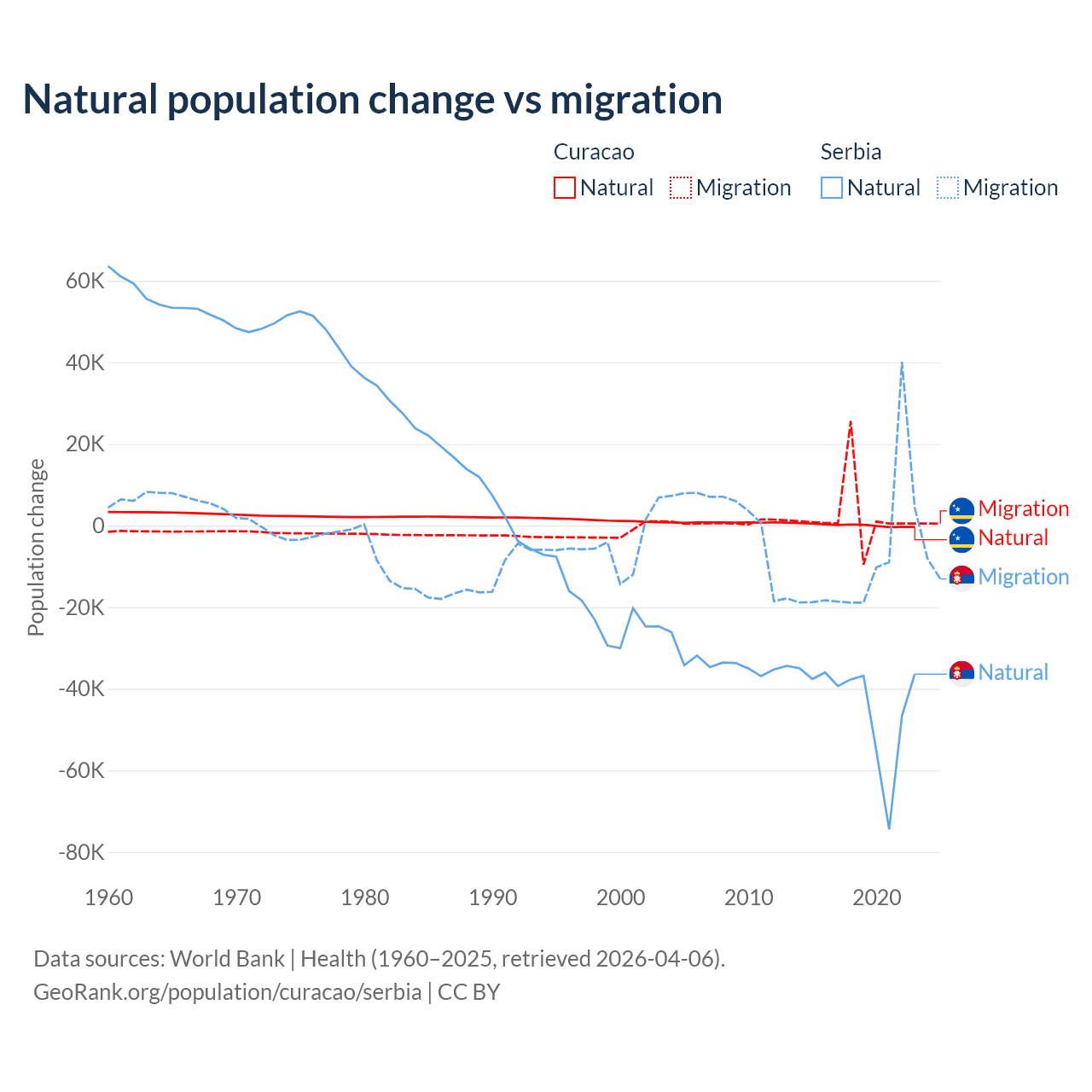 Over the last 10 years, 3.72% of the population change in Curacao is from natural causes (a gain of 834 people) and 96.3% is from migration (a gain of 21,615 people). In Serbia 83.3% is from natural causes (a loss of 435,148 people) and 16.7% is from migration (a loss of 87,110 people).