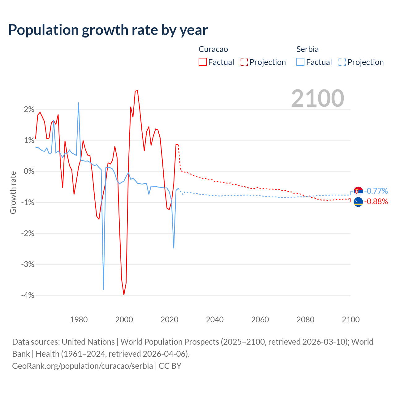 - For the last 10 years, Curacao has had an average growth rate of +0.13% per year vs -0.76% in Serbia.