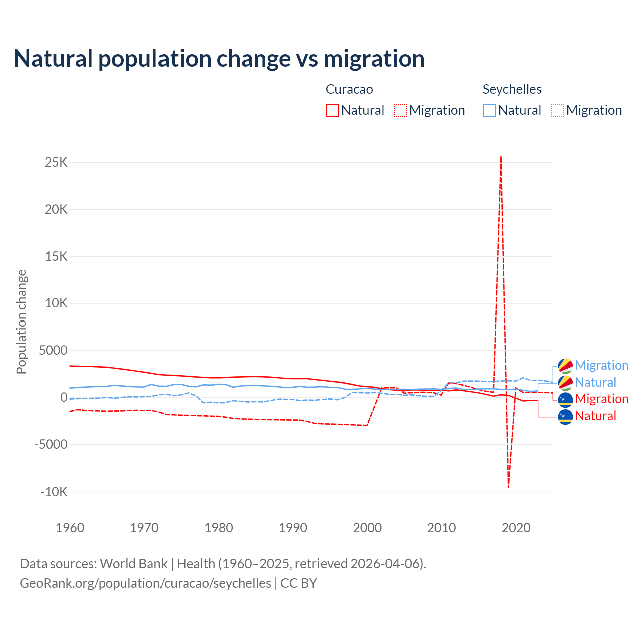 Over the last 10 years, 3.72% of the population change in Curacao is from natural causes (a gain of 834 people) and 96.3% is from migration (a gain of 21,615 people). In the Seychelles 31.4% is from natural causes (a gain of 8,122 people) and 68.6% is from migration (a gain of 17,748 people).