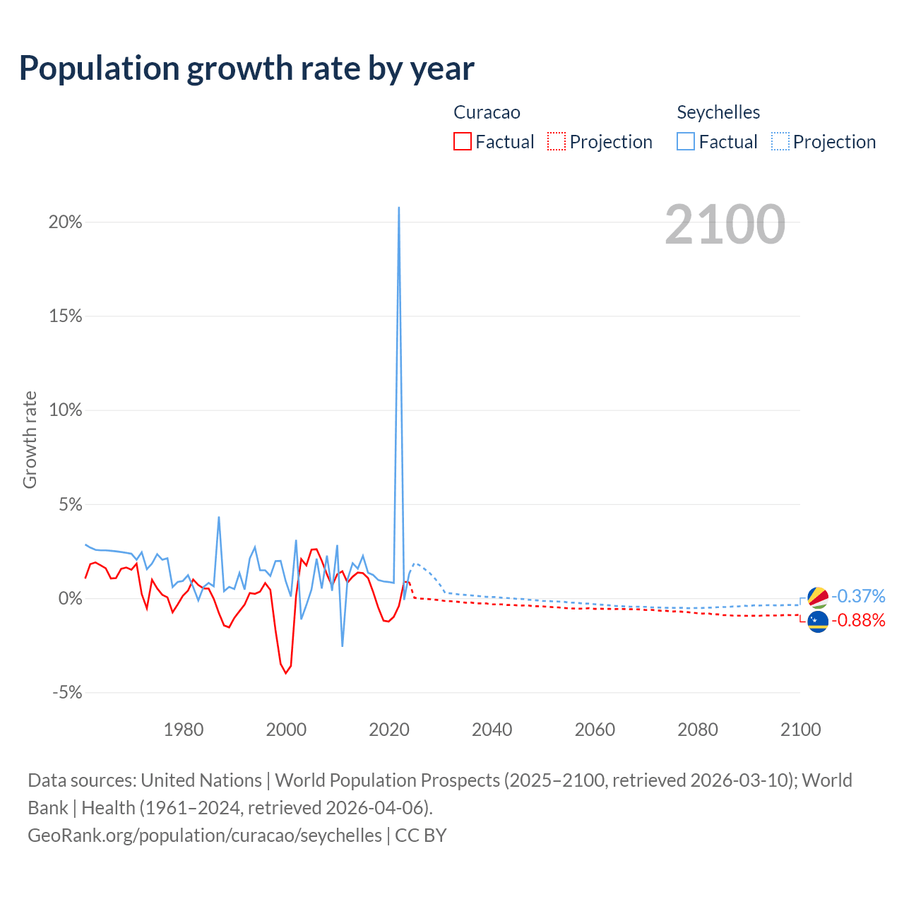 - Since 2006, the population of Curacao has increased from 141K people to 156K (10.4% growth), while the Seychelles has grown from 84.6K to 126K (49.3% growth).