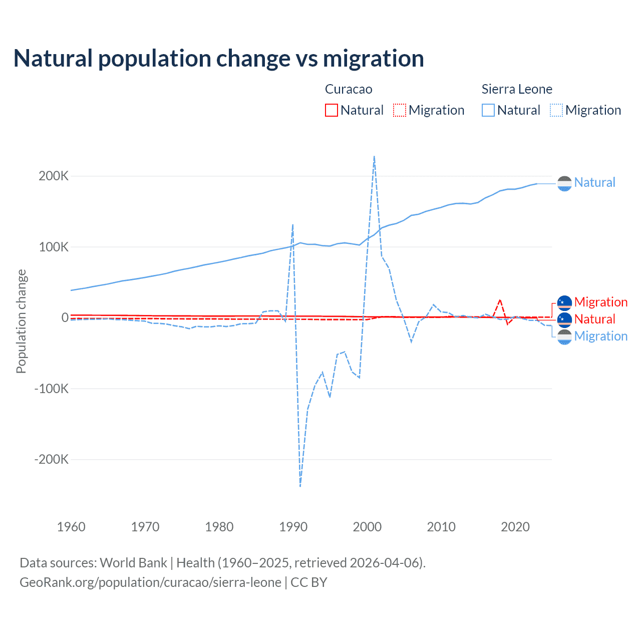 Over the last 10 years, 3.72% of the population change in Curacao is from natural causes (a gain of 834 people) and 96.3% is from migration (a gain of 21,615 people). In Sierra Leone 99.6% is from natural causes (a gain of 1,764,049 people) and 0.41% is from migration (a loss of 7,211 people).