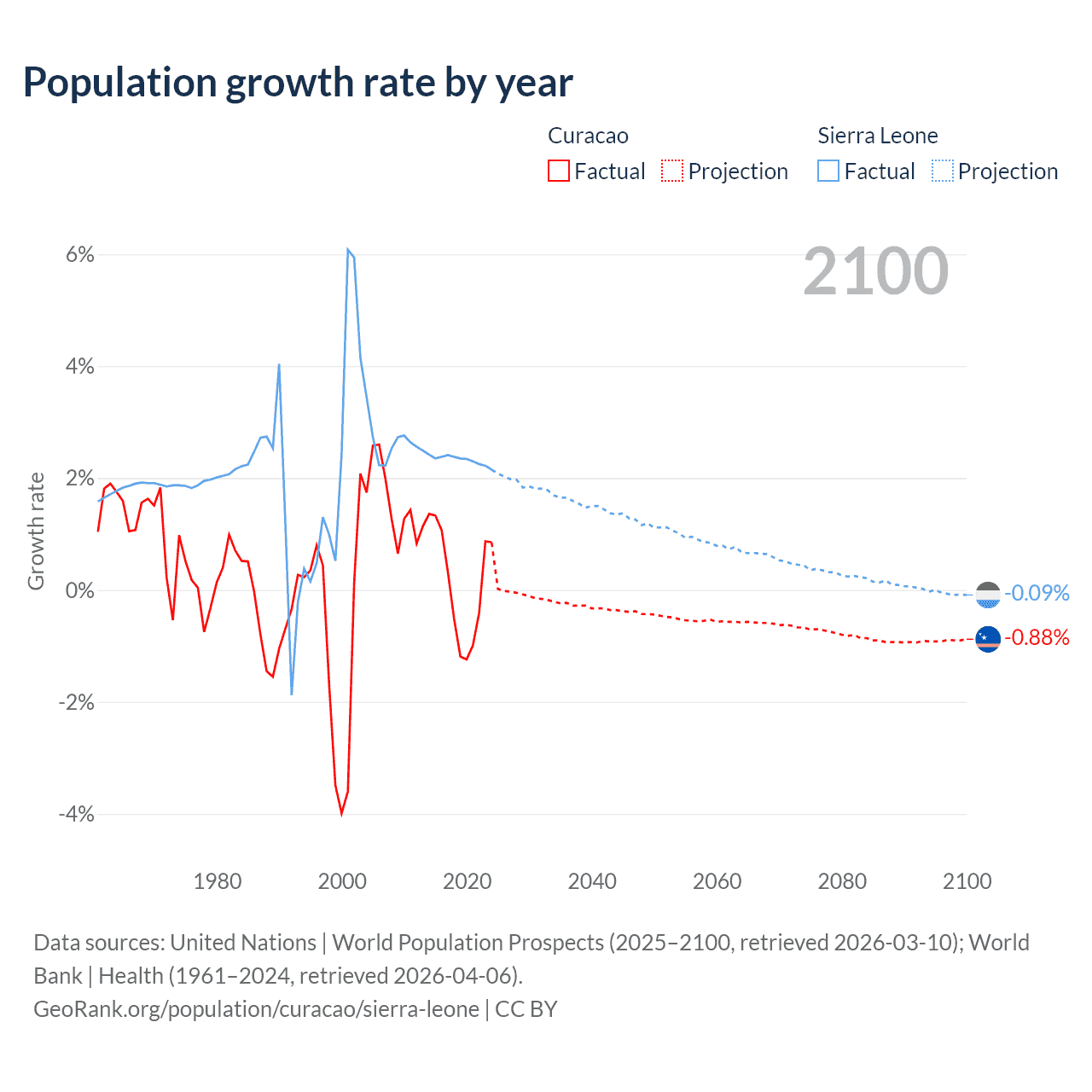 - For the last 10 years, Curacao has had an average growth rate of +0.13% per year vs +2.32% in Sierra Leone.