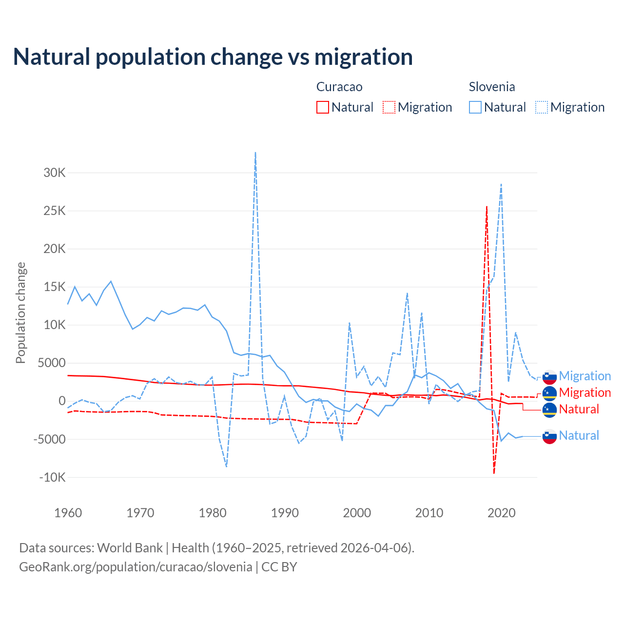 Over the last 10 years, 3.72% of the population change in Curacao is from natural causes (a gain of 834 people) and 96.3% is from migration (a gain of 21,615 people). In Slovenia 18.1% is from natural causes (a loss of 17,573 people) and 81.9% is from migration (a gain of 79,532 people).