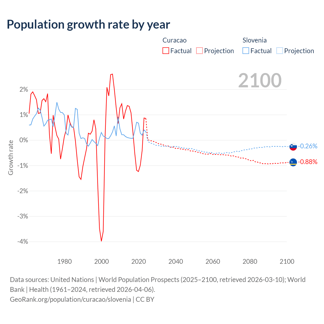 - For the last 10 years, Curacao has had an average growth rate of +0.13% per year vs +0.29% in Slovenia.