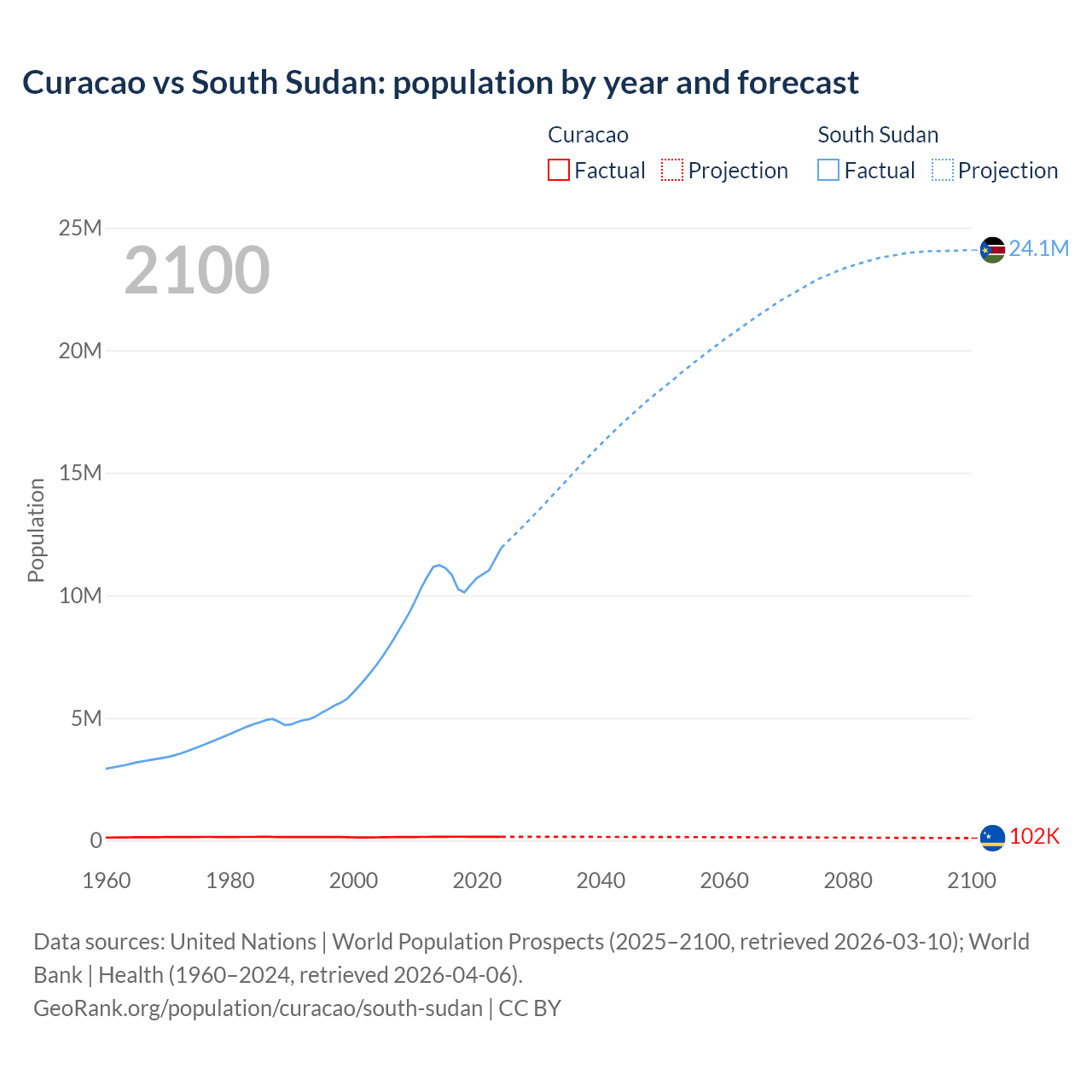 Population differences between Curacao and South Sudan