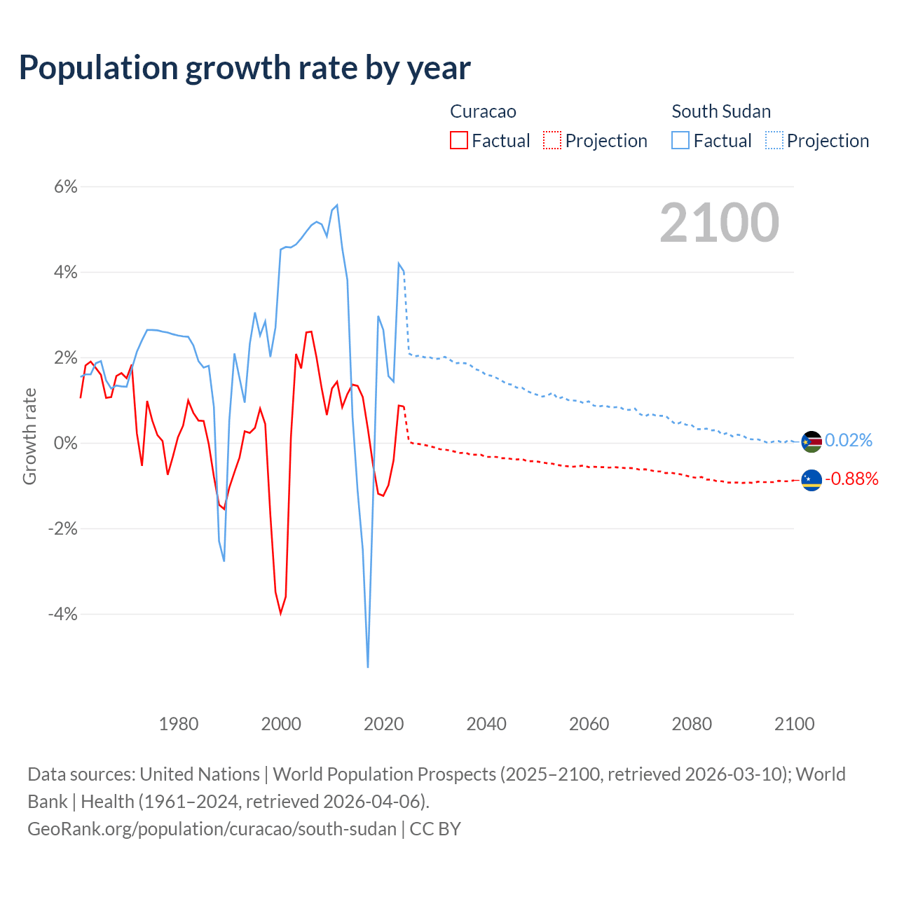 - For the last 10 years, Curacao has had an average growth rate of +0.13% per year vs +0.65% in South Sudan.