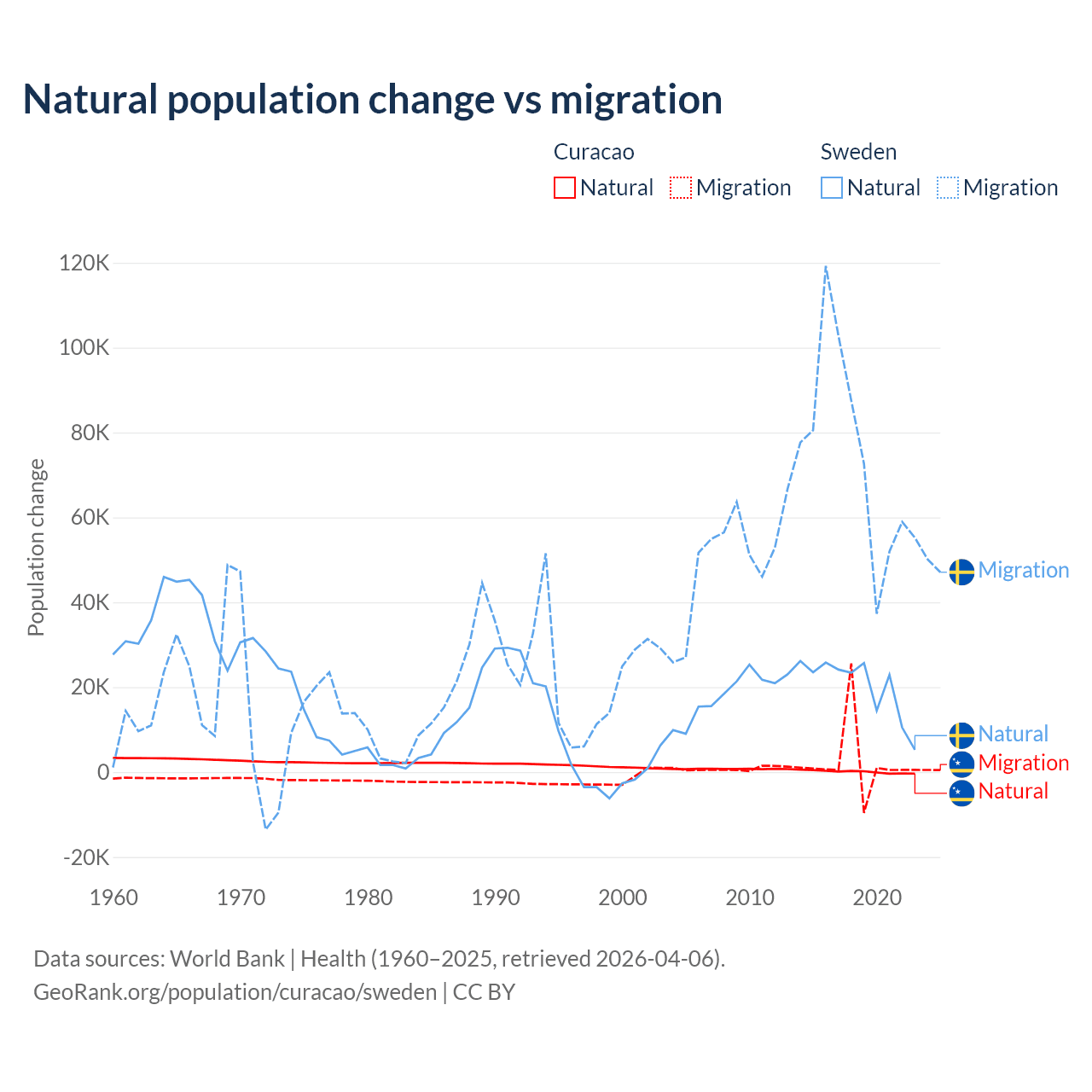 Over the last 10 years, 3.72% of the population change in Curacao is from natural causes (a gain of 834 people) and 96.3% is from migration (a gain of 21,615 people). In Sweden 21.4% is from natural causes (a gain of 201,900 people) and 78.6% is from migration (a gain of 743,642 people).