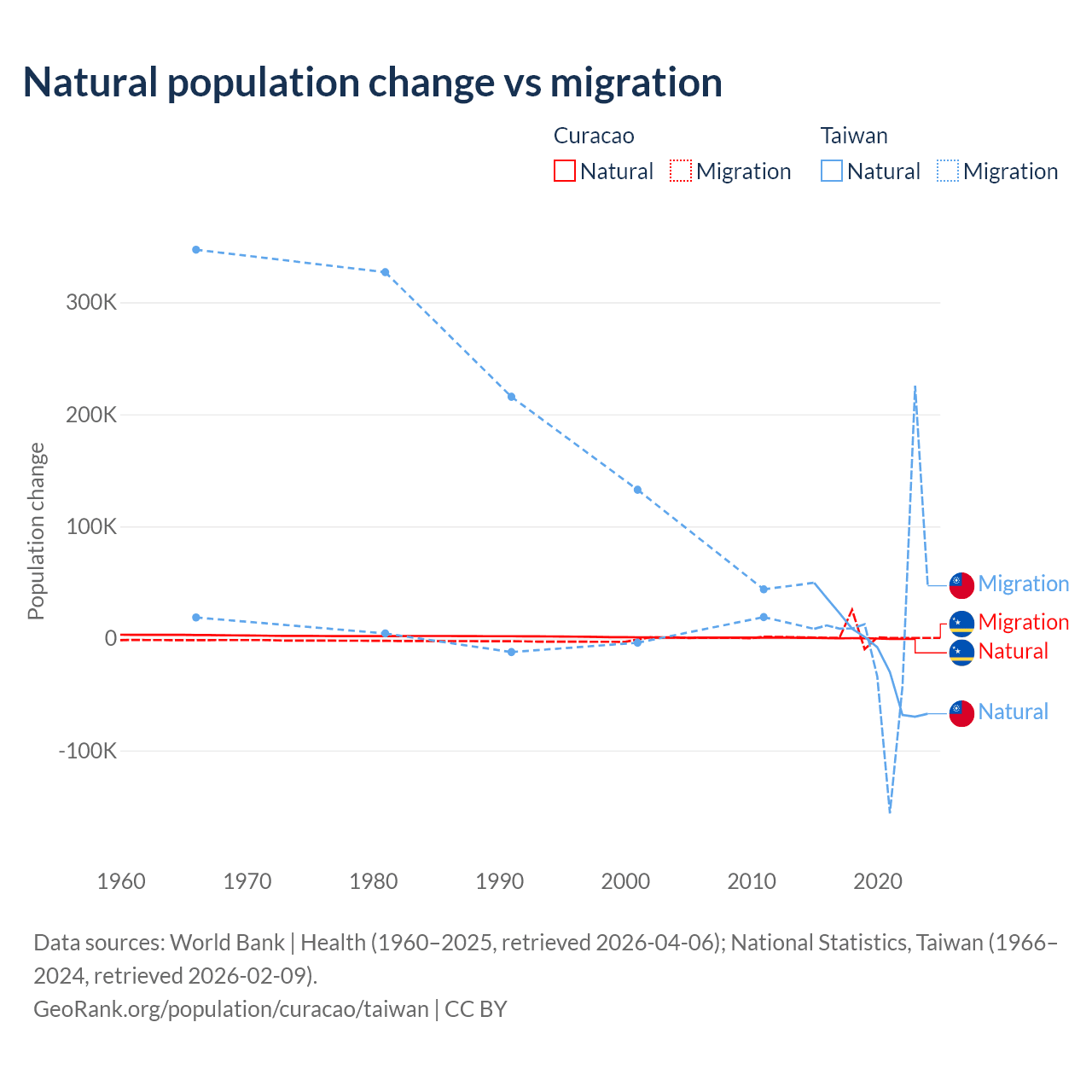 Over the last 10 years, 3.72% of the population change in Curacao is from natural causes (a gain of 834 people) and 96.3% is from migration (a gain of 21,615 people). In Taiwan 56.7% is from natural causes (a loss of 57,467 people) and 43.3% is from migration (a gain of 43,884 people).