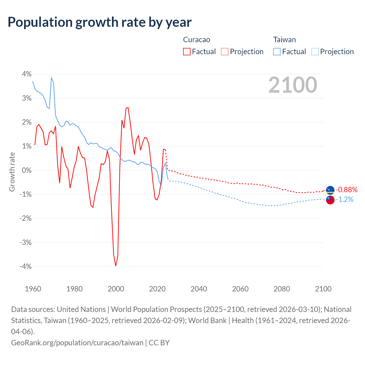 - For the last 10 years, Curacao has had an average growth rate of +0.13% per year vs -0.03% in Taiwan.