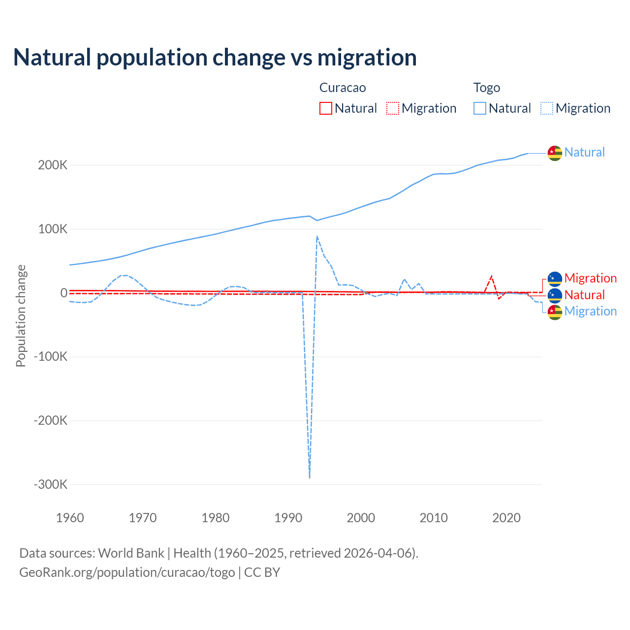 Over the last 10 years, 3.72% of the population change in Curacao is from natural causes (a gain of 834 people) and 96.3% is from migration (a gain of 21,615 people). In Togo 99.1% is from natural causes (a gain of 2,052,115 people) and 0.86% is from migration (a loss of 17,852 people).