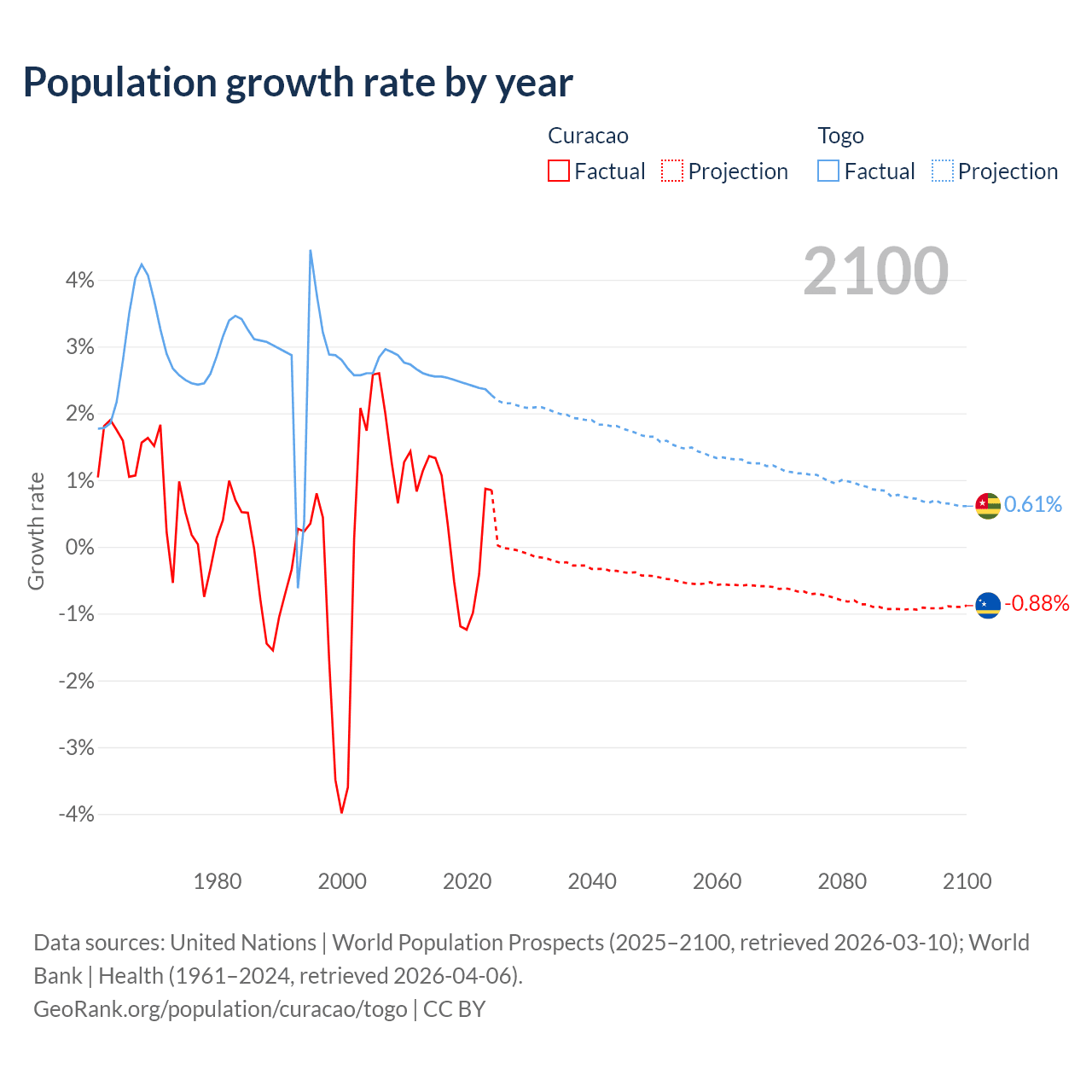 - For the last 10 years, Curacao has had an average growth rate of +0.13% per year vs +2.46% in Togo.