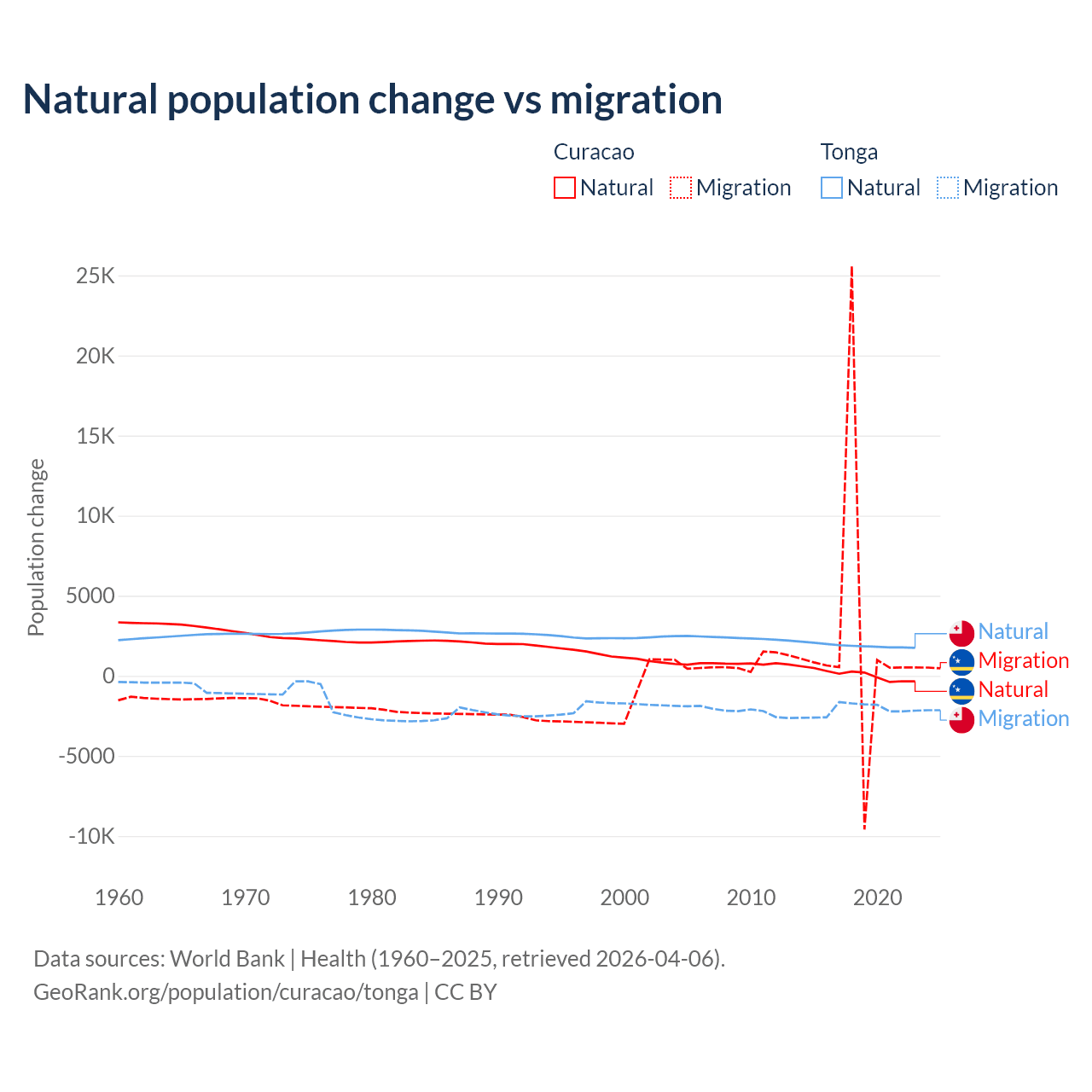Over the last 10 years, 3.72% of the population change in Curacao is from natural causes (a gain of 834 people) and 96.3% is from migration (a gain of 21,615 people). In Tonga 46.9% is from natural causes (a gain of 18,919 people) and 53.1% is from migration (a loss of 21,384 people).