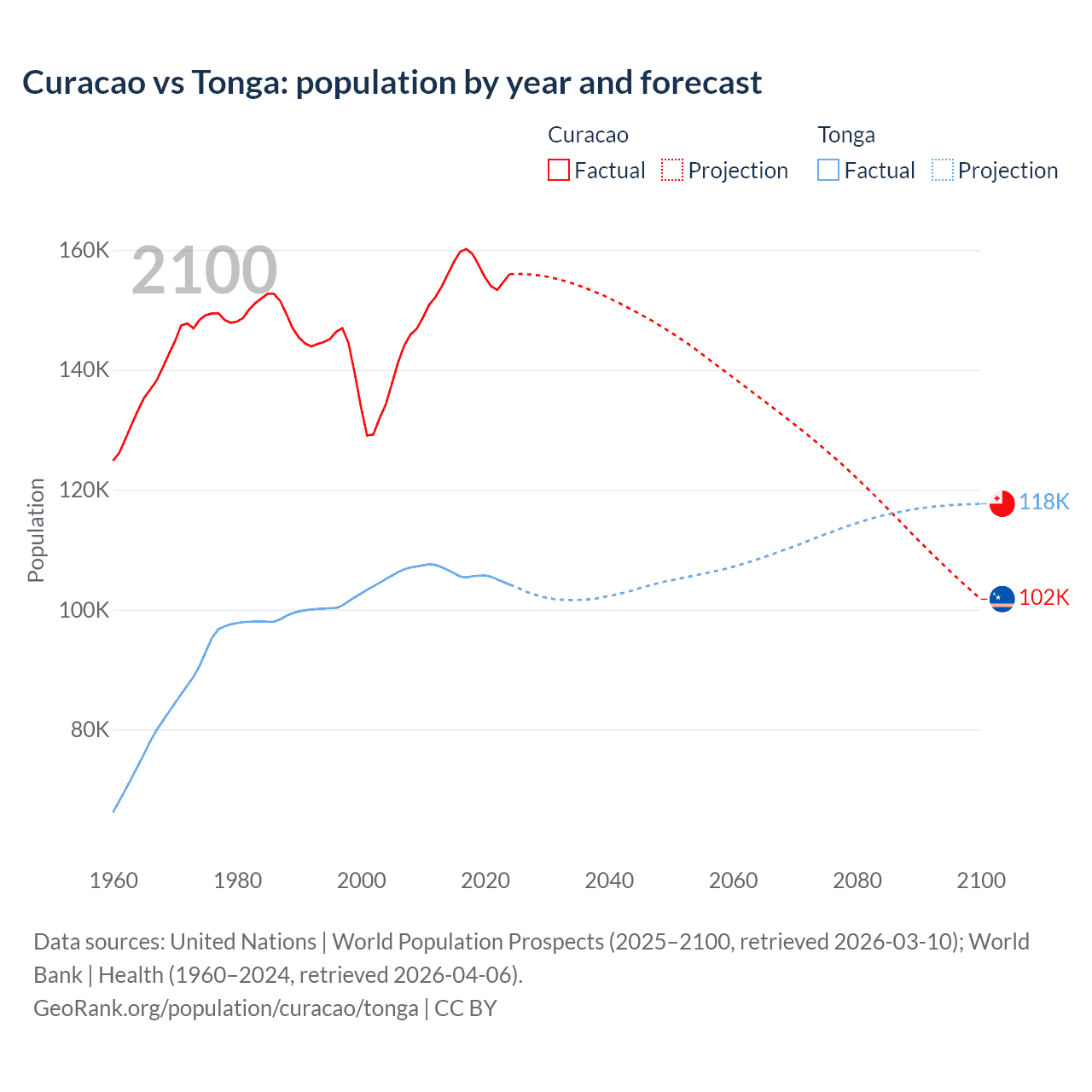The latest officially reported population of Curacao was 155,967 in 2024 vs 104,175 people in Tonga in 2024. In 2026, based on the adjusted UN estimation, the current Curacao's population is 155,976 people compared to 103,309 in Tonga.