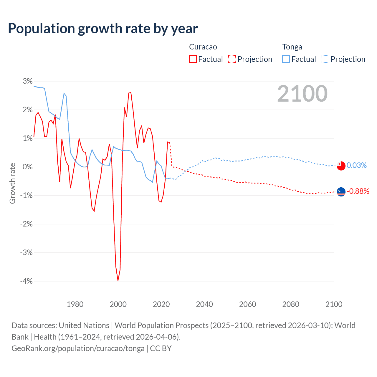 - For the last 10 years, Curacao has had an average growth rate of +0.13% per year vs -0.25% in Tonga.