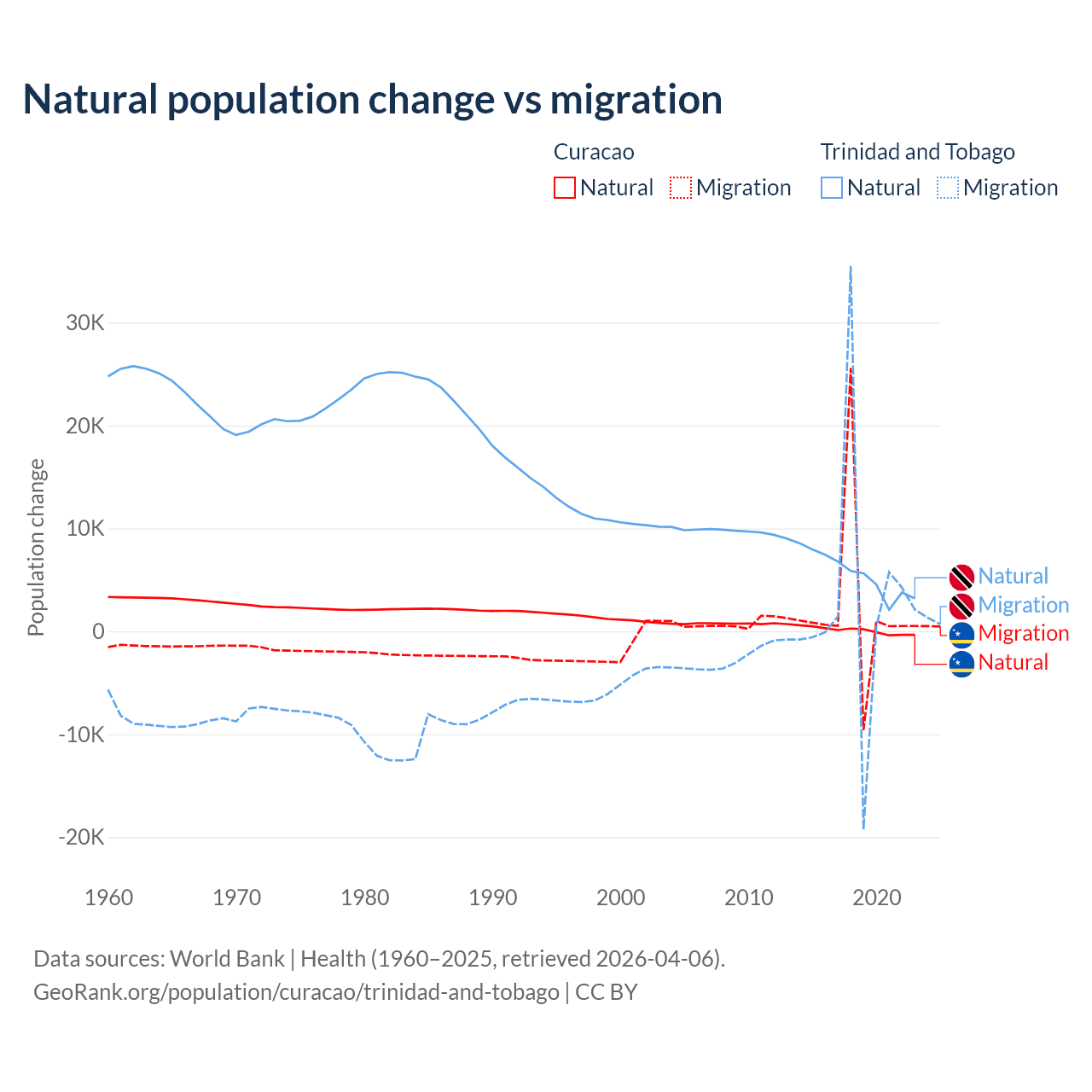 Over the last 10 years, 3.72% of the population change in Curacao is from natural causes (a gain of 834 people) and 96.3% is from migration (a gain of 21,615 people). In Trinidad and Tobago 66% is from natural causes (a gain of 55,887 people) and 34% is from migration (a gain of 28,785 people).