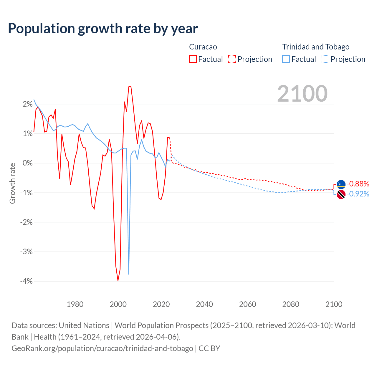 - For the last 10 years, Curacao has had an average growth rate of +0.13% per year vs +0.19% in Trinidad and Tobago.