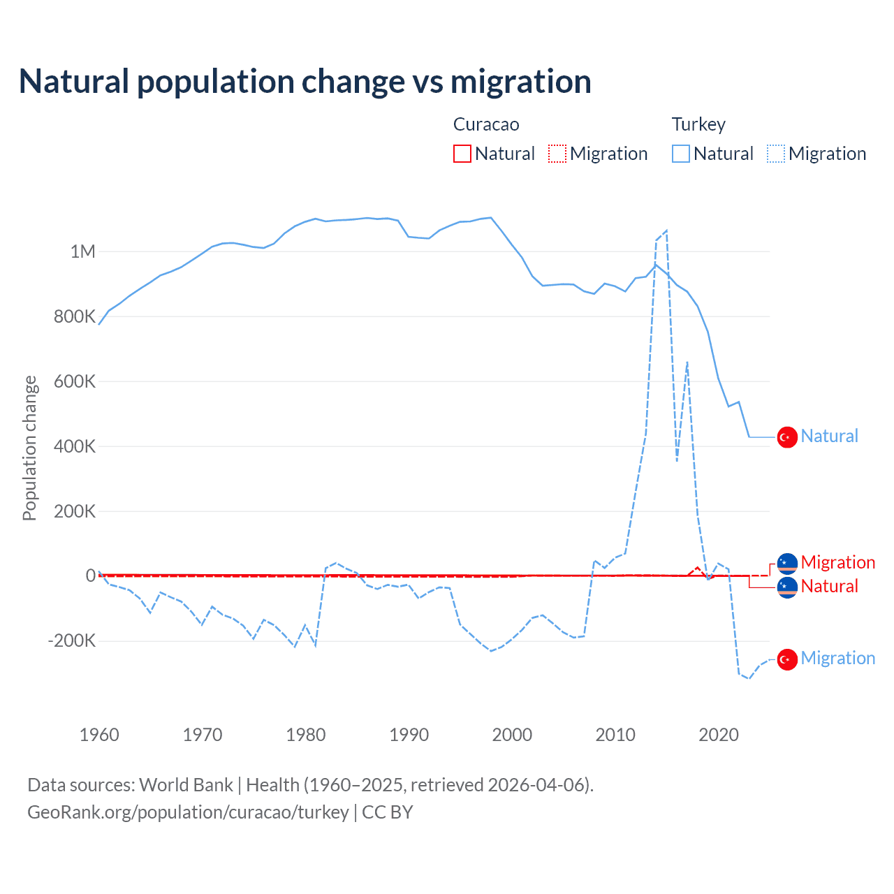 Over the last 10 years, 3.72% of the population change in Curacao is from natural causes (a gain of 834 people) and 96.3% is from migration (a gain of 21,615 people). In Turkey 73% is from natural causes (a gain of 7,333,352 people) and 27% is from migration (a gain of 2,718,916 people).