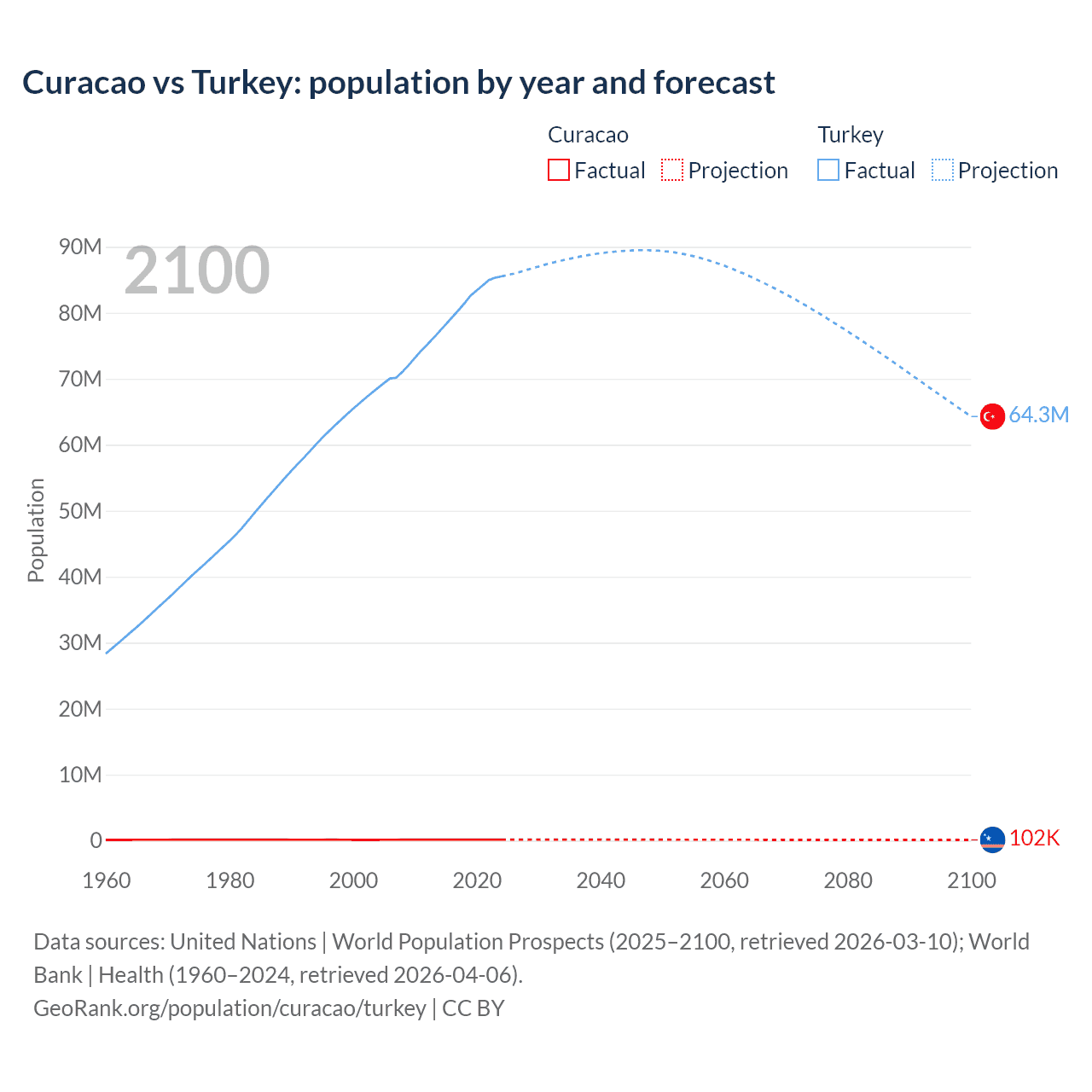 The latest officially reported population of Curacao was 155,967 in 2024 vs 85,518,661 people in Turkey in 2024. In 2026, based on the adjusted UN estimation, the current Curacao's population is 155,976 people compared to 86,002,379 in Turkey.
