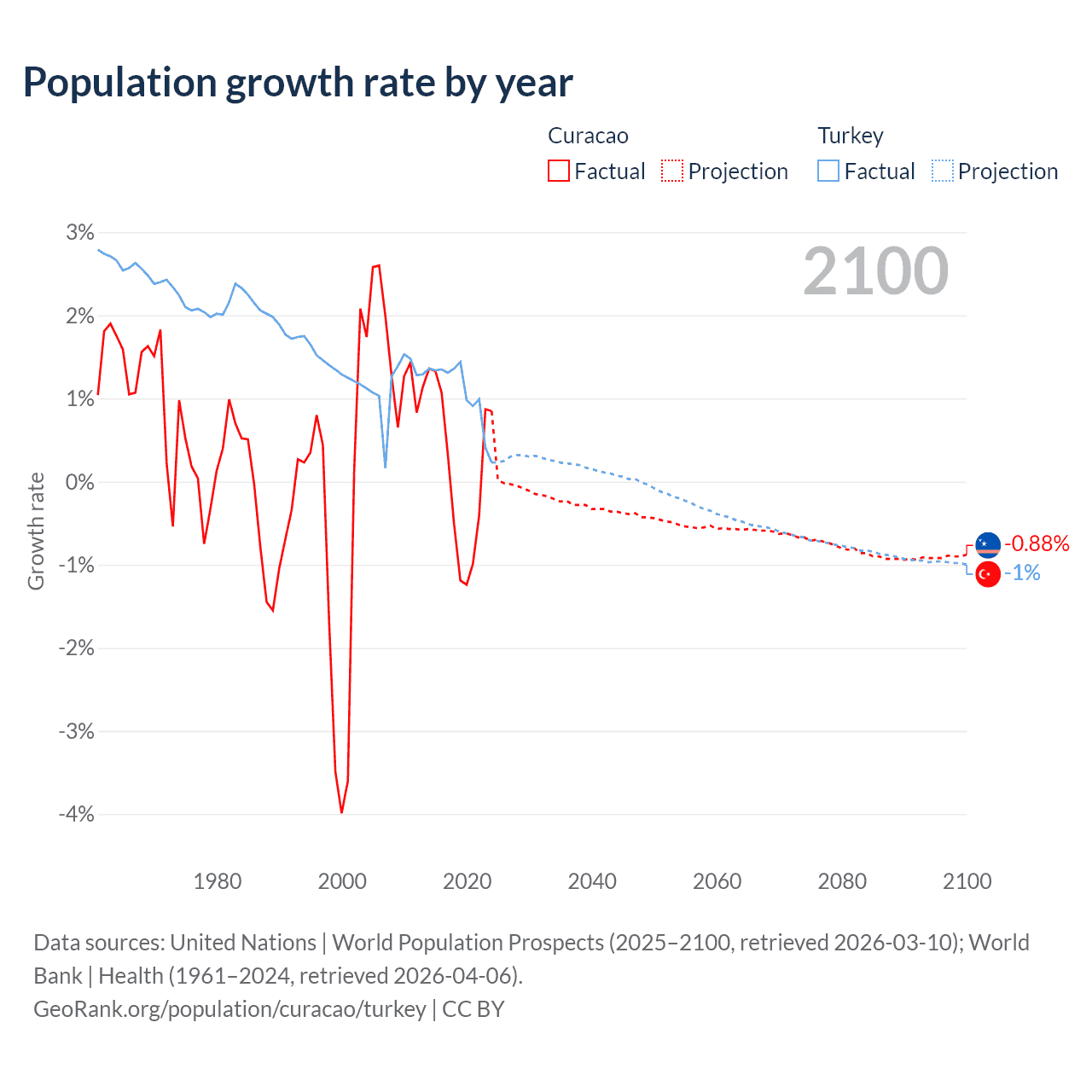 - For the last 10 years, Curacao has had an average growth rate of +0.13% per year vs +1.06% in Turkey.