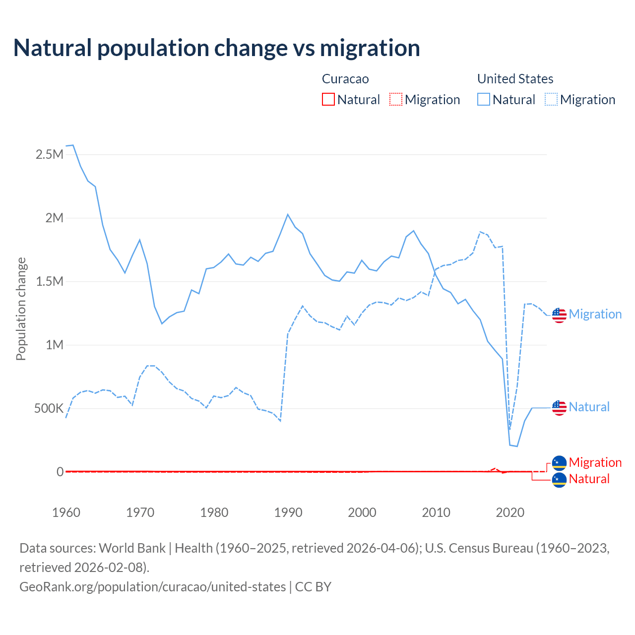 Over the last 10 years, 3.72% of the population change in Curacao is from natural causes (a gain of 834 people) and 96.3% is from migration (a gain of 21,615 people). In the United States 35.8% is from natural causes (a gain of 8,005,866 people) and 64.2% is from migration (a gain of 14,334,286 people).