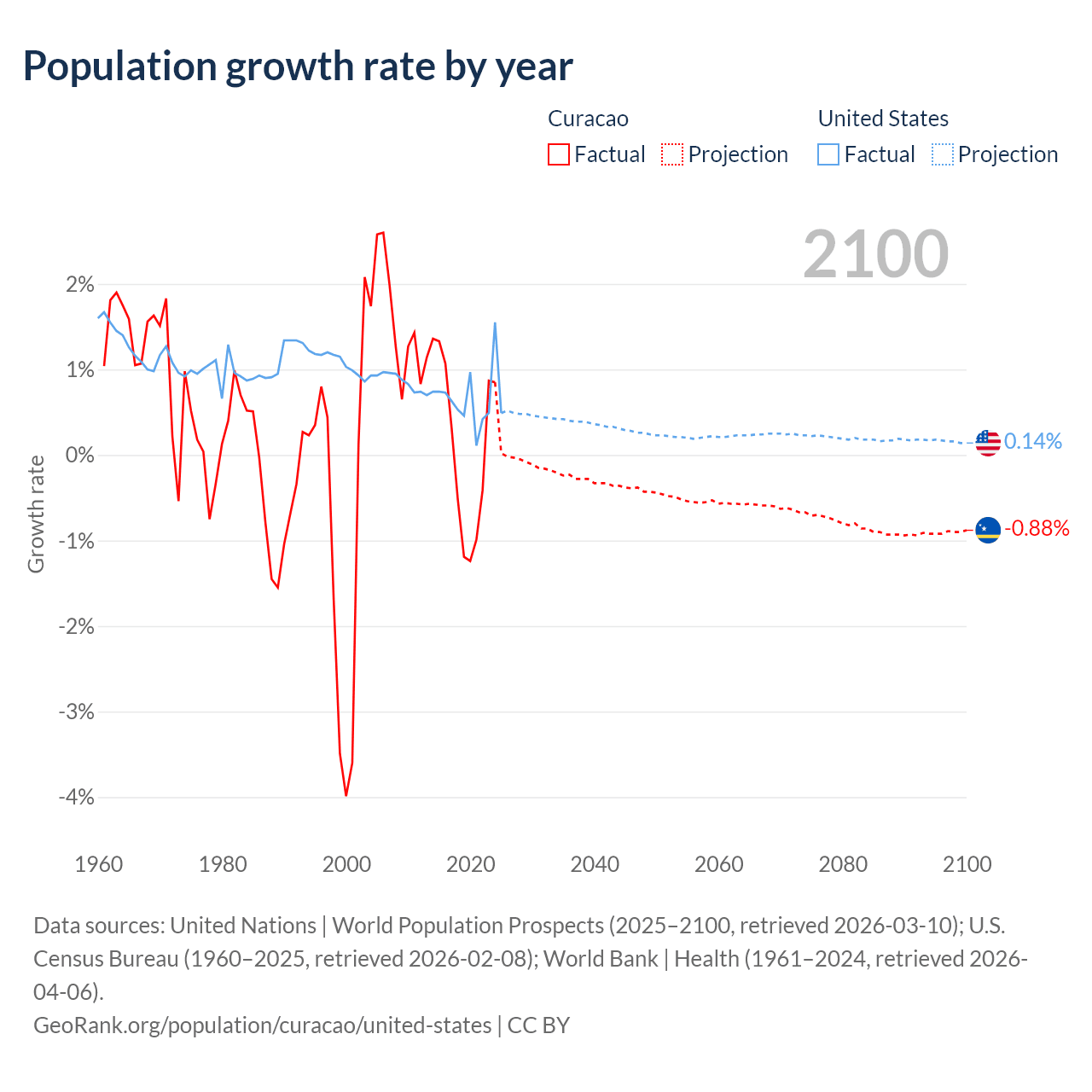 - For the last 10 years, Curacao has had an average growth rate of +0.13% per year vs +0.65% in the United States.