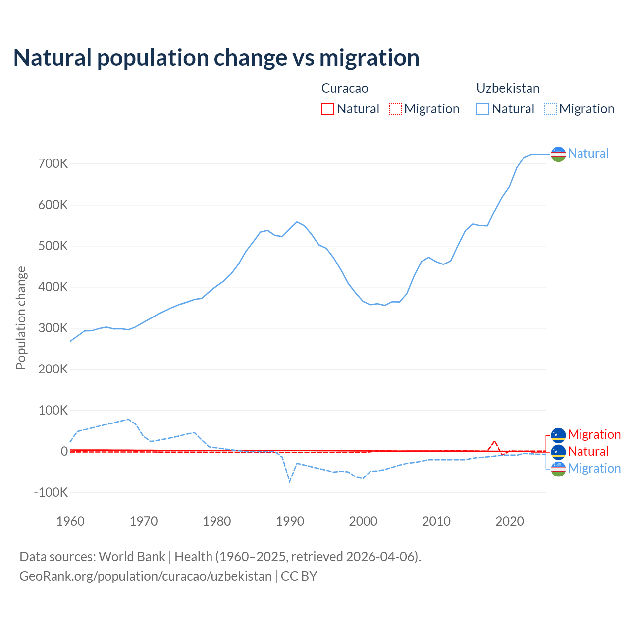 Over the last 10 years, 3.72% of the population change in Curacao is from natural causes (a gain of 834 people) and 96.3% is from migration (a gain of 21,615 people). In Uzbekistan 98.2% is from natural causes (a gain of 6,161,117 people) and 1.84% is from migration (a loss of 115,398 people).