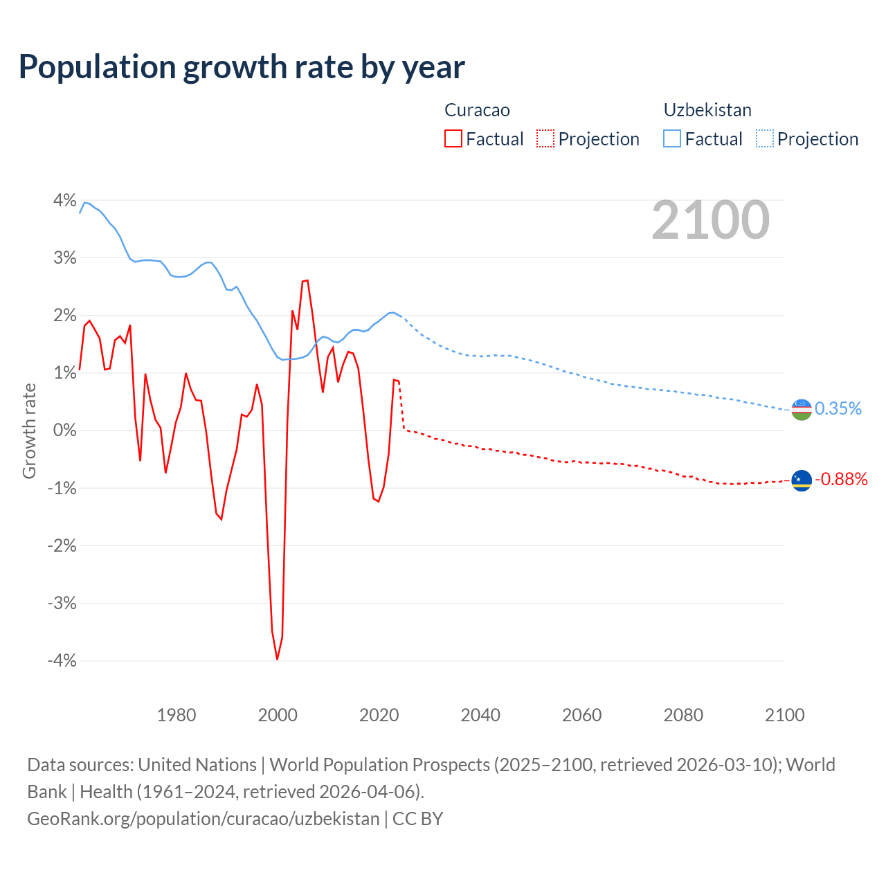 - For the last 10 years, Curacao has had an average growth rate of +0.13% per year vs +1.85% in Uzbekistan.